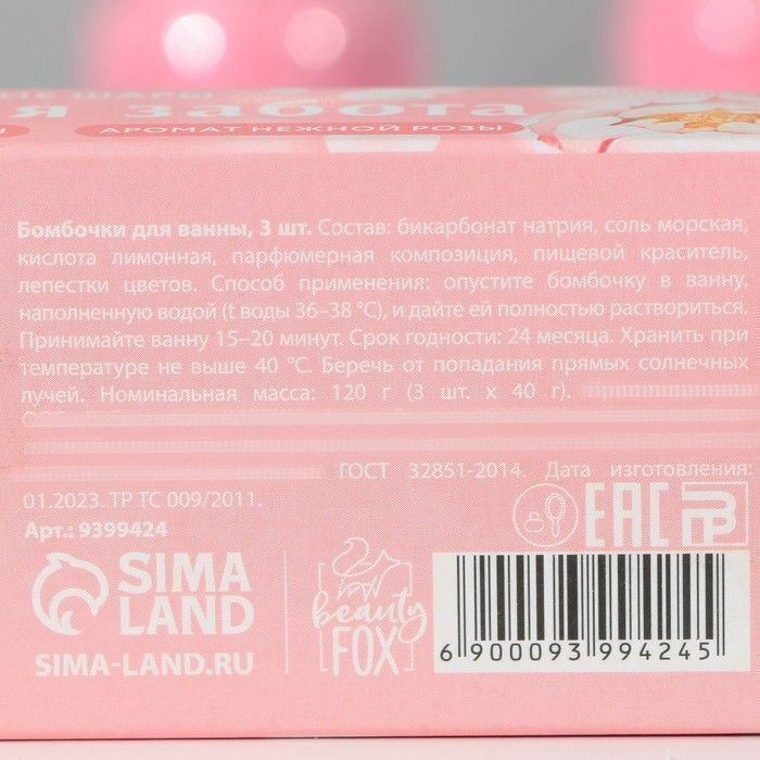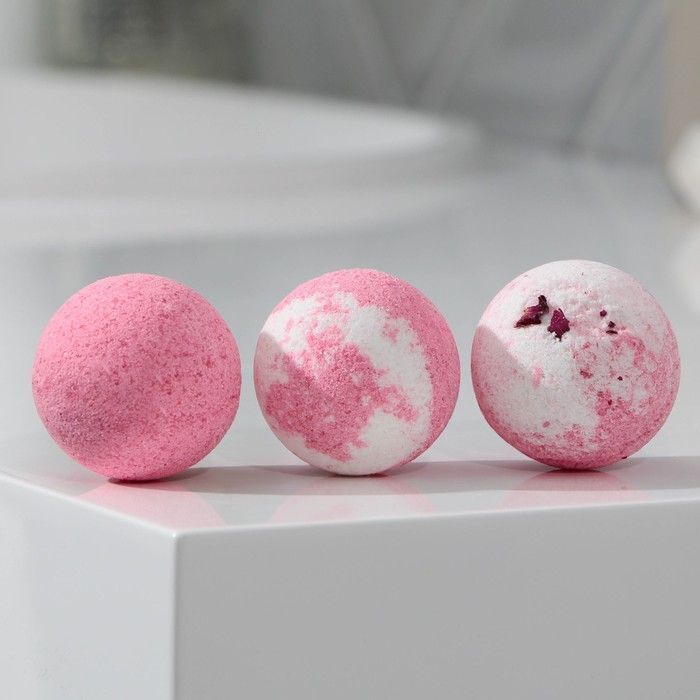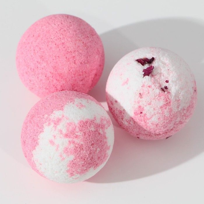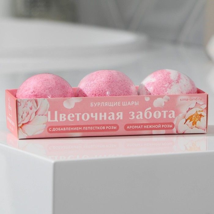 Бомбочки имеют округлую форму и представлены в нежных розовых оттенках с вкраплениями, что делает их не только полезными, но и красивыми. Упаковка выполнена в пастельных тонах и украшена изображением цветка розы, что добавляет эстетическую ценность. Набор упакован в удобную коробку, что делает его отличным вариантом для подарка.