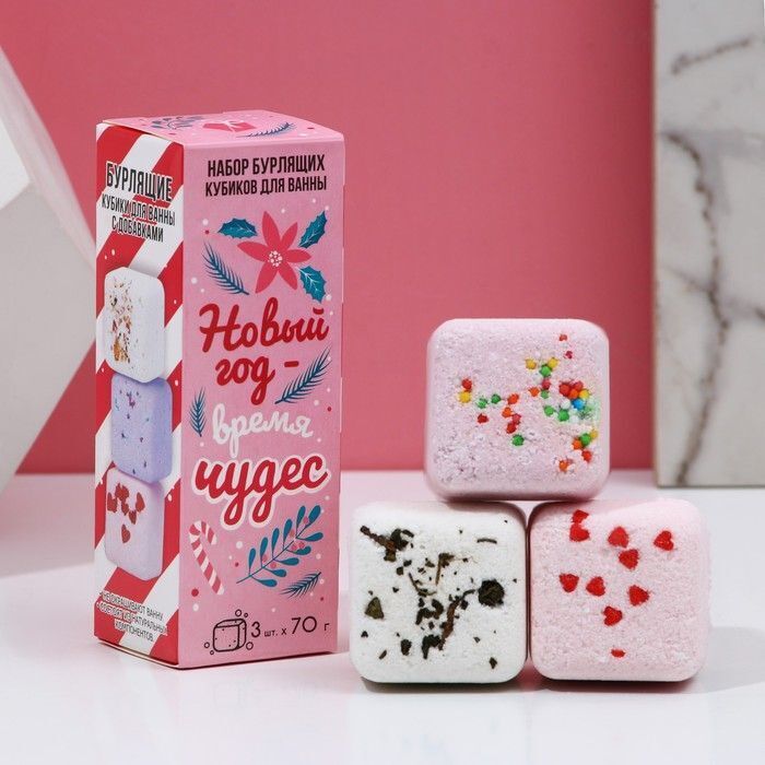 В набор входят 3 бурлящих кубика, каждый из которых весит 70 г. Кубики имеют разные цвета: розовый с яркими шариками, белый с черными частичками и белый с красными сердечками. Упаковка выполнена в ярком розовом цвете с новогодними элементами, что делает ее отличным подарком для друзей и семьи.