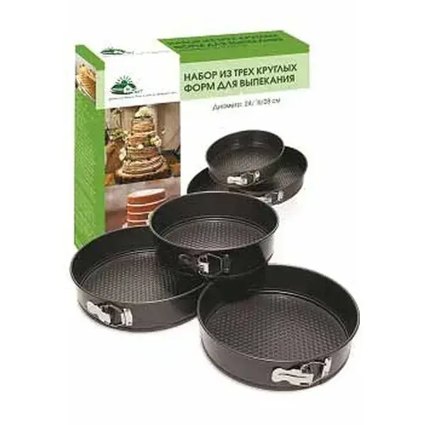 В комплекте: 3 формы (18, 20 и 24 см в диаметре), фирменная упаковка из плотного картона для хранения. Произведено в России по стандартам качества ГОСТ Р 50866-96.