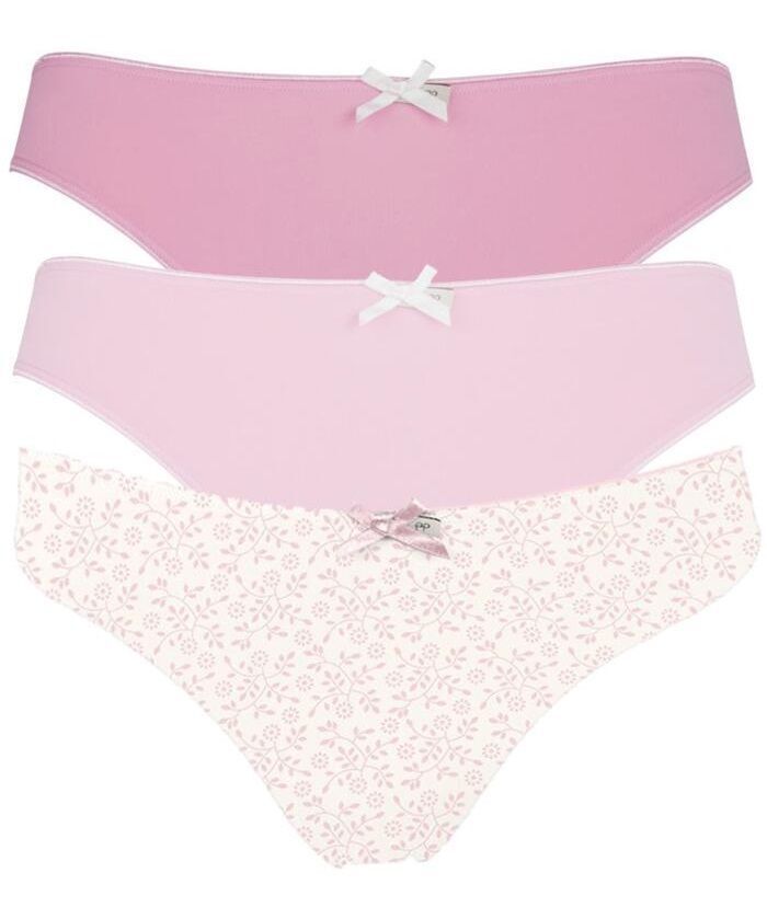 В набор входят три трусика размера L: два однотонных (розовых разных оттенков) и один с нежным цветочным принтом. Модель имеет удобную широкую резинку и декоративный бантик спереди.