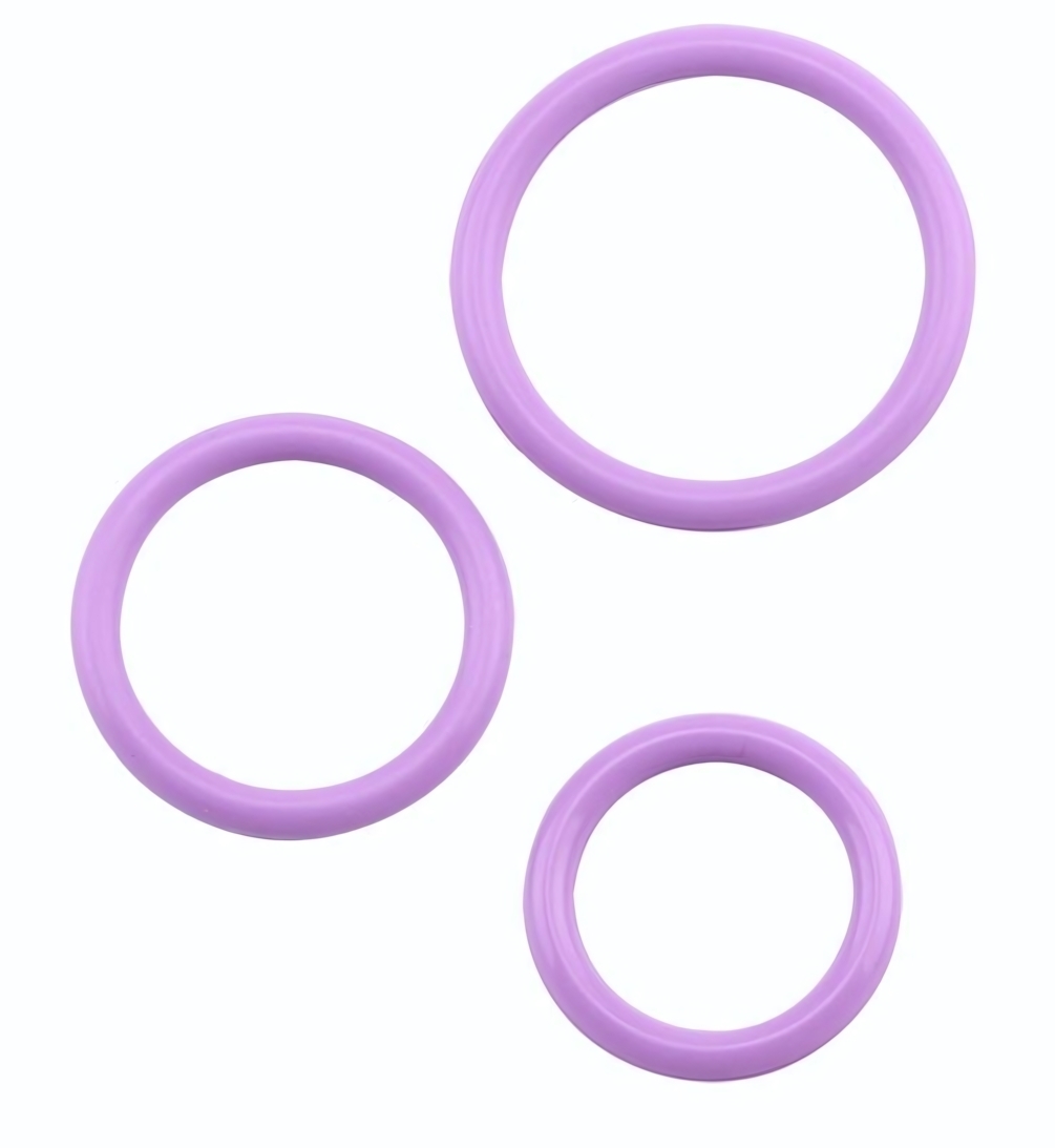 Силикон высокого качества обеспечивает безопасность использования. Набор включает три размера (диаметр 5, 4,2 и 3,2 см), что позволяет подобрать идеально подходящее кольцо. Стильный сиреневый цвет добавляет эстетики.