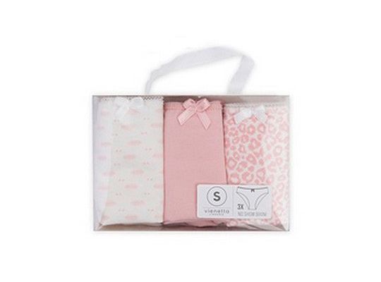 - Разнообразие в одном наборе: Набор включает три разные расцветки — однотонный нежный розовый, белый с мелким розовым рисунком и белый со стильным леопардовым принтом. Это позволяет комбинировать бельё с разной одеждой.