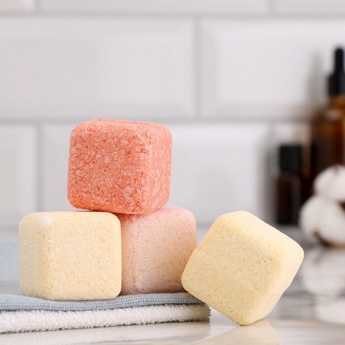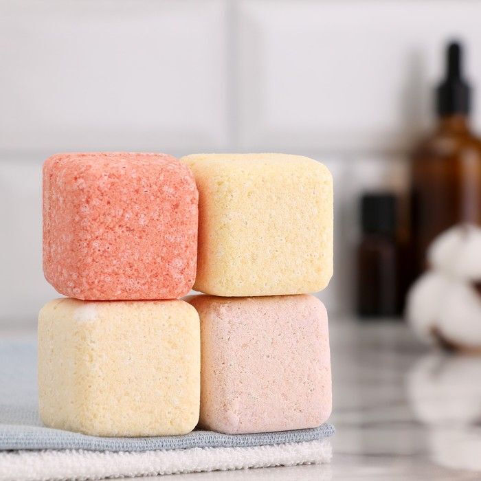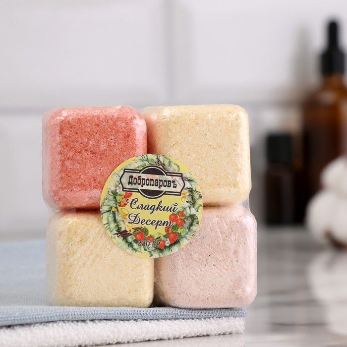 В наборе вы получите 4 бомбочки по 70 г каждая, что позволяет вам наслаждаться ароматами на протяжении длительного времени. Бомбочки имеют квадратную форму и представлены в различных цветах: розовом, желтом, белом и светло-розовом. Они идеально подойдут для личного ухода или в качестве подарка для близких.