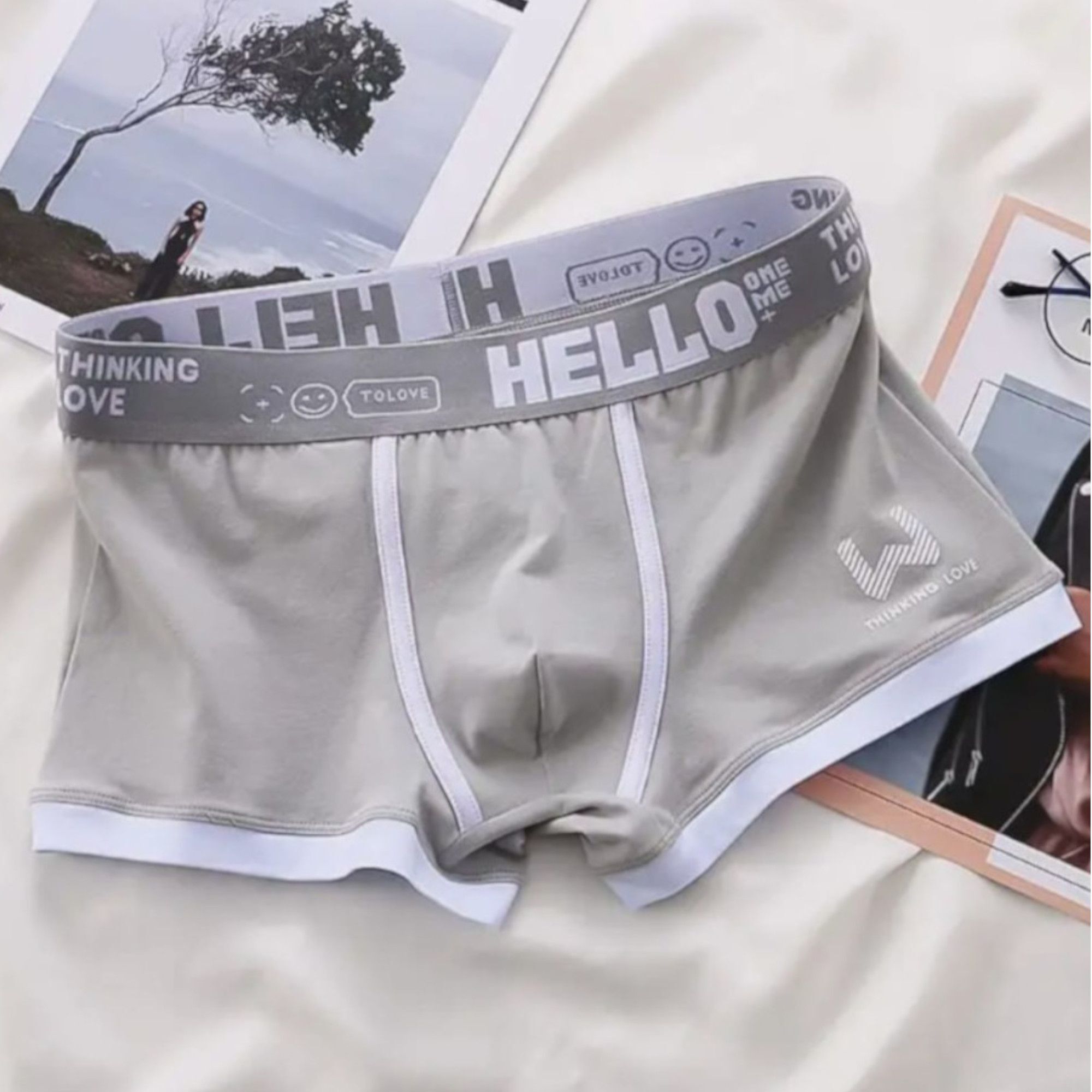 В комплекте: 4 пары трусов разных цветов с фирменными надписями "HELLO" и "THINKING LOVE" на резинке. Дизайн дополнен контрастной строчкой и логотипом "W" на левой штанине.