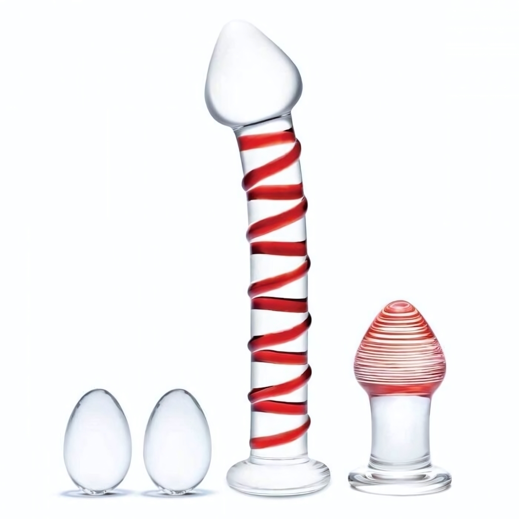 Набор из 4 стеклянных аксессуаров предлагает безграничные возможности для экспериментов. Рельефные поверхности, эргономичные формы и температурная чувствительность материала создают неповторимый опыт как для solo-практик, так и парных игр.