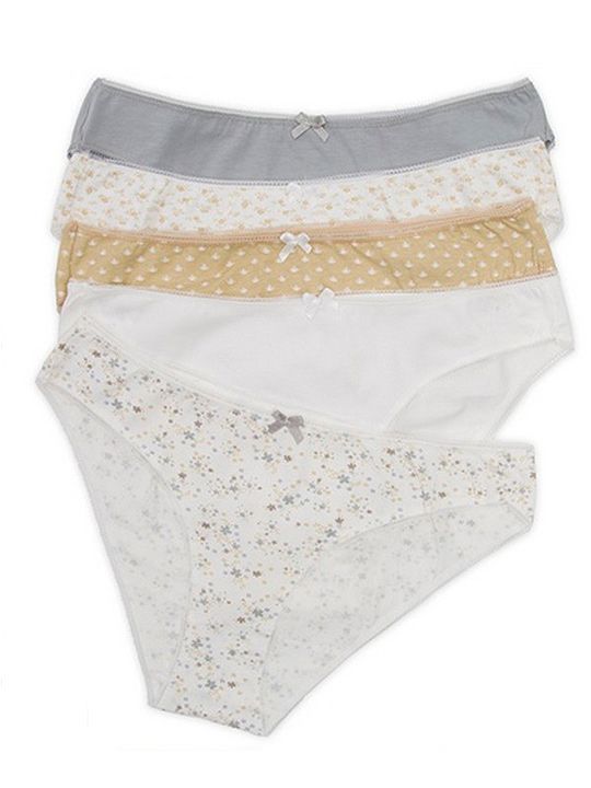 Вы получаете пять пар трусиков. Цвета в ассортименте (микс) и могут включать однотонные варианты (белый, серый, бежевый) и модели с нежным мелким рисунком или цветочным принтом. Отгружается один набор, конкретные расцветки определяются случайным образом из доступного ассортимента, что делает покупку немного интригующей.