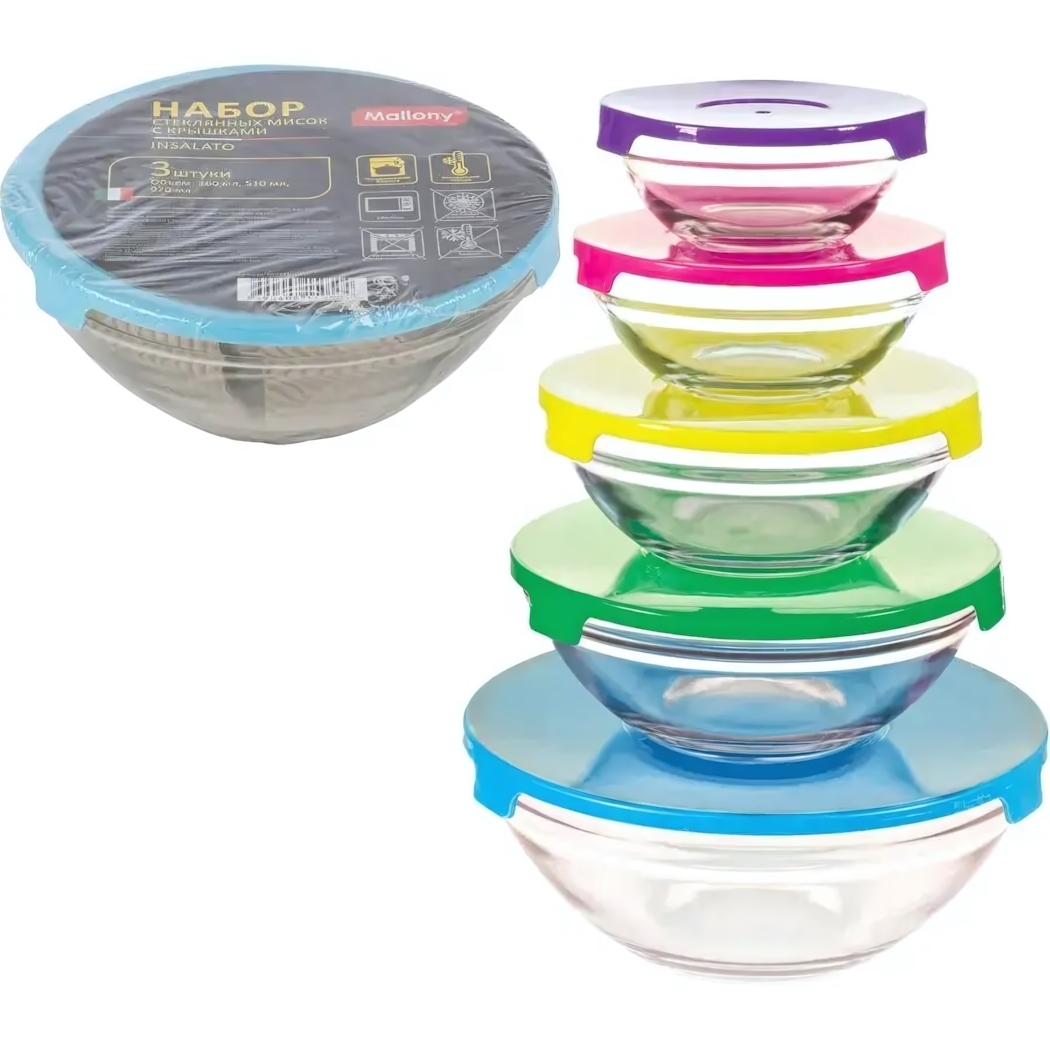 Миски объемом 920 мл идеально подходят для салатов, закусок и других блюд. Цветные крышки не только украшают кухню, но и помогают быстро найти нужную емкость.