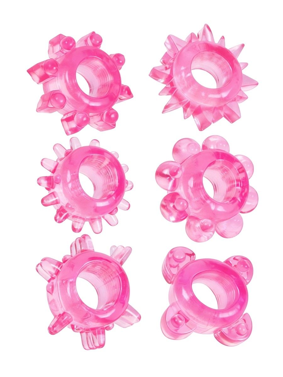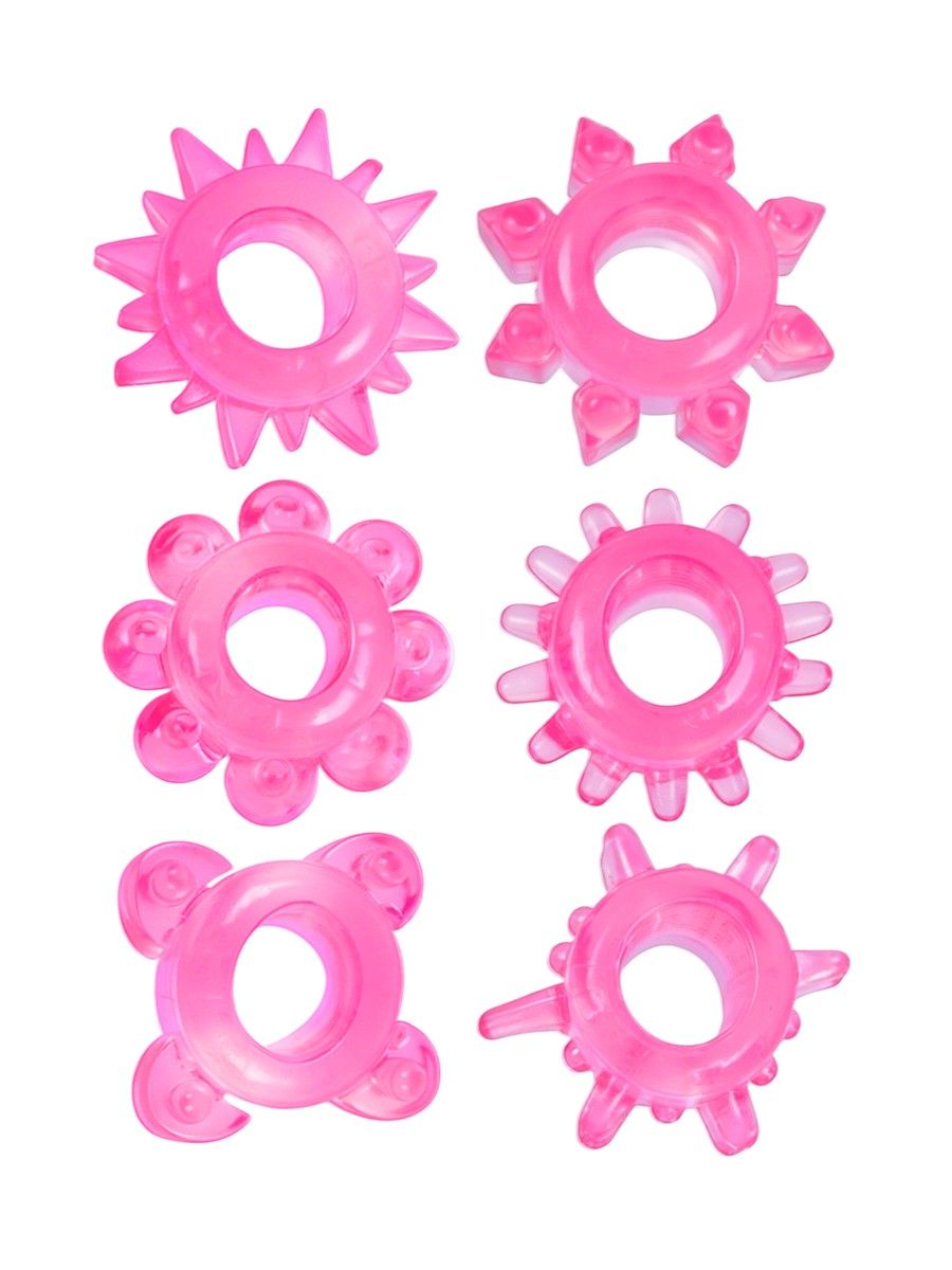 В комплект входит 6 колец с различным рельефом, что позволяет выбирать оптимальный вариант в зависимости от настроения и желаемых ощущений. Вы сможете экспериментировать и находить наиболее комфортную форму и текстуру. Материал приятен на ощупь, отличается гибкостью и упругостью, что особенно важно для деликатных аксессуаров.