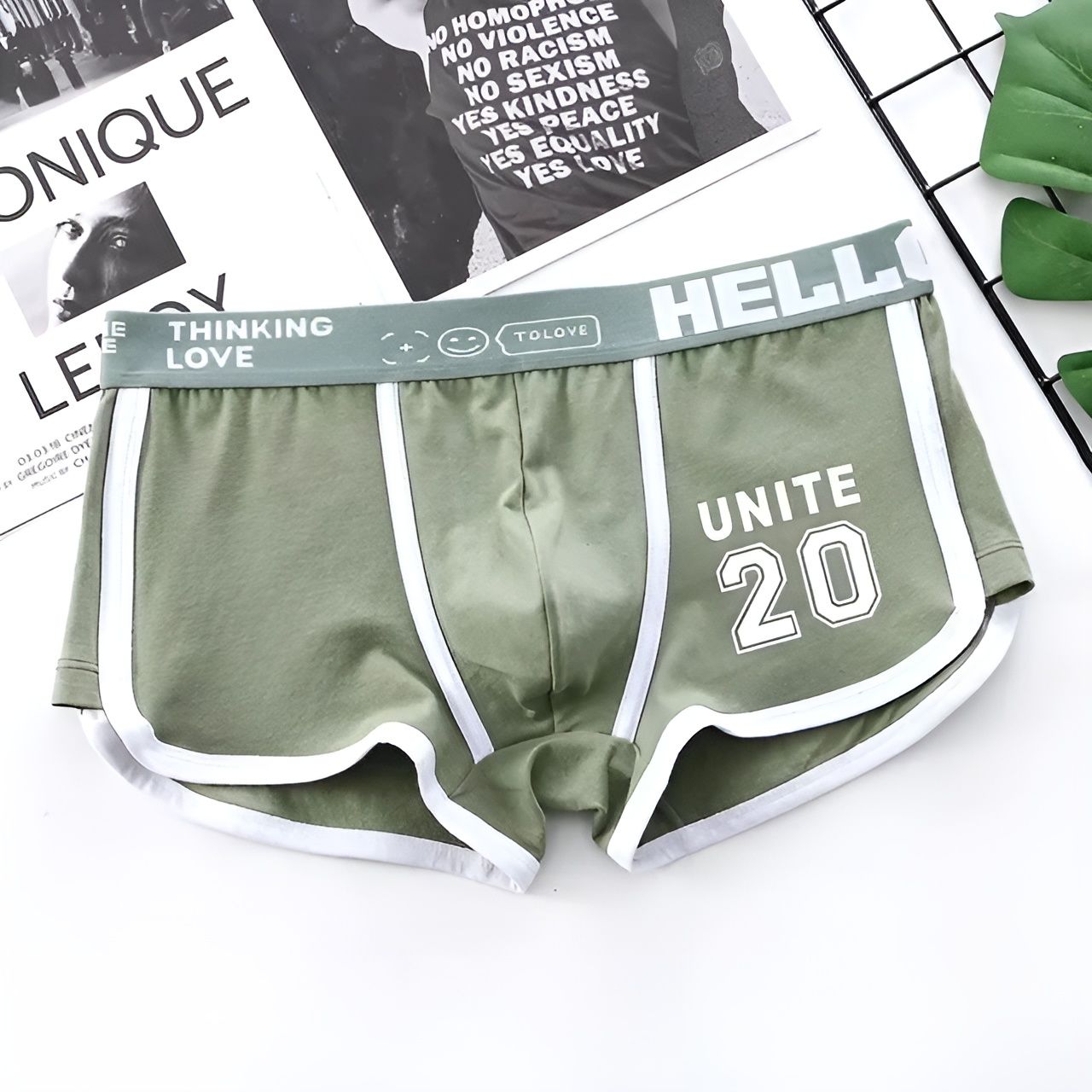 - Продуманный дизайн: широкая эластичная поясная резинка с контрастными надписями (HELLO, TOLOVE, THINKING LOVE, ONE ME) и графическими элементами. На передней части каждой пары — крупный принт «UNITE 20».