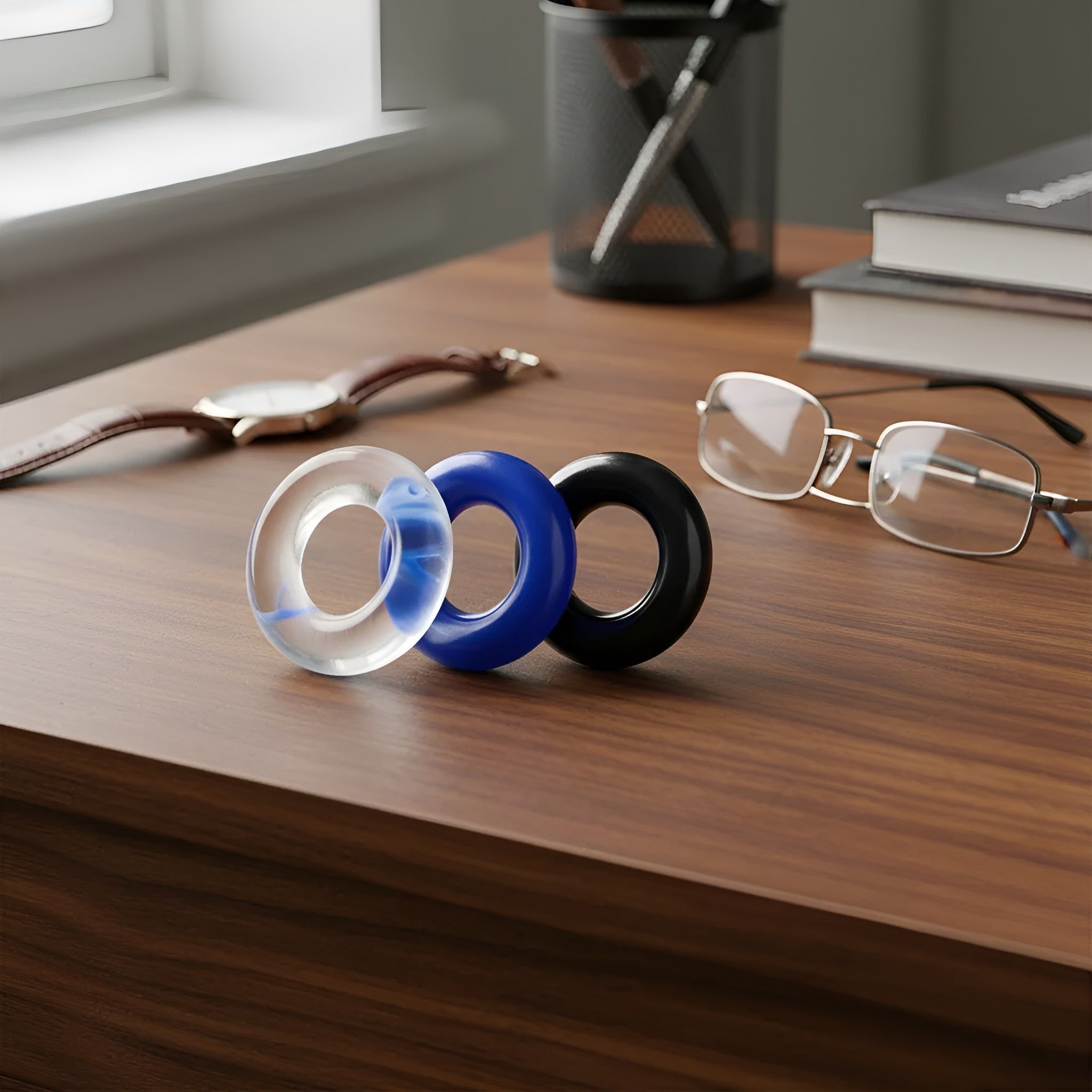 Внутренний диаметр колец составляет 1,8 см, что делает их универсальными для большинства мужчин. Набор включает три кольца: черное, синее и прозрачное, что позволяет выбрать наиболее подходящее для каждого случая. Эти кольца не требуют сложного ухода и могут использоваться многократно, что делает их практичным и экономичным выбором.