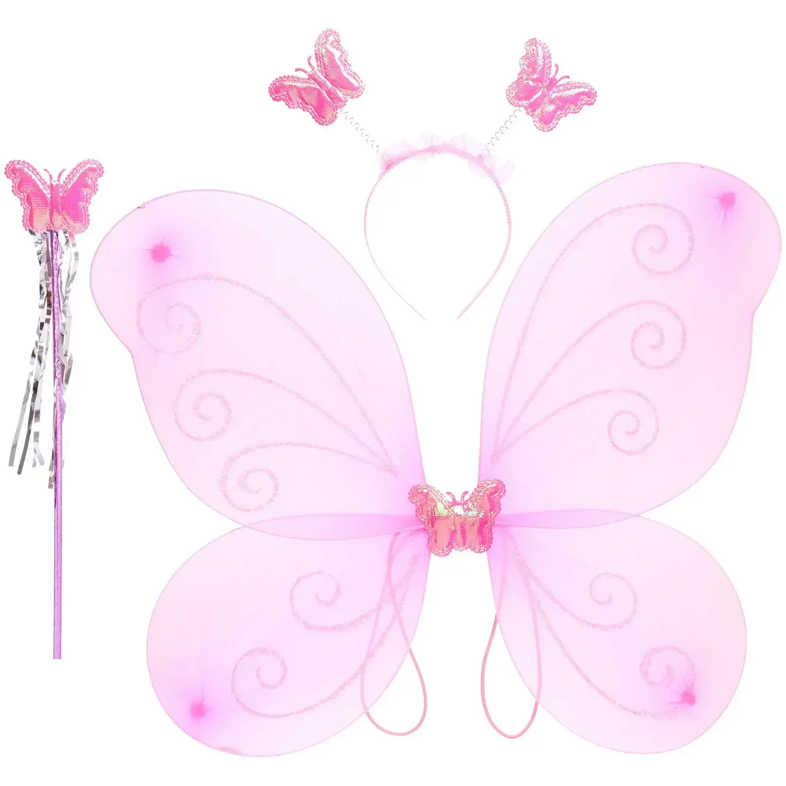 Каждый элемент набора изготовлен из качественных материалов: ободок и крылья выполнены из легкого текстиля, а палочка — из прочного пластика. Это обеспечивает долговечность и комфорт при ношении. Декор в виде бабочек и блестящих элементов добавляет игривости и делает образ завершенным. Набор не только красив, но и практичен — он легко чистится и хранится.