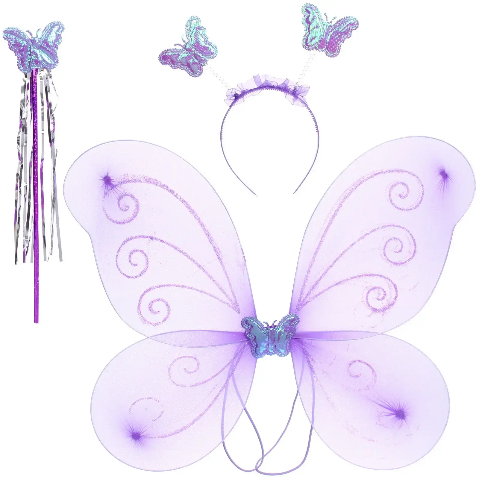 Крылья имеют светло-лавандовый цвет с декоративными узорами, а ободок украшен двумя маленькими бабочками. Волшебная палочка выполнена в фиолетовом цвете и дополнена лентами из серебристой и фиолетовой ткани. Все элементы набора легкие и удобные, что позволяет детям наслаждаться игрой без ограничений. Этот набор станет отличным подарком для любого маленького мечтателя!