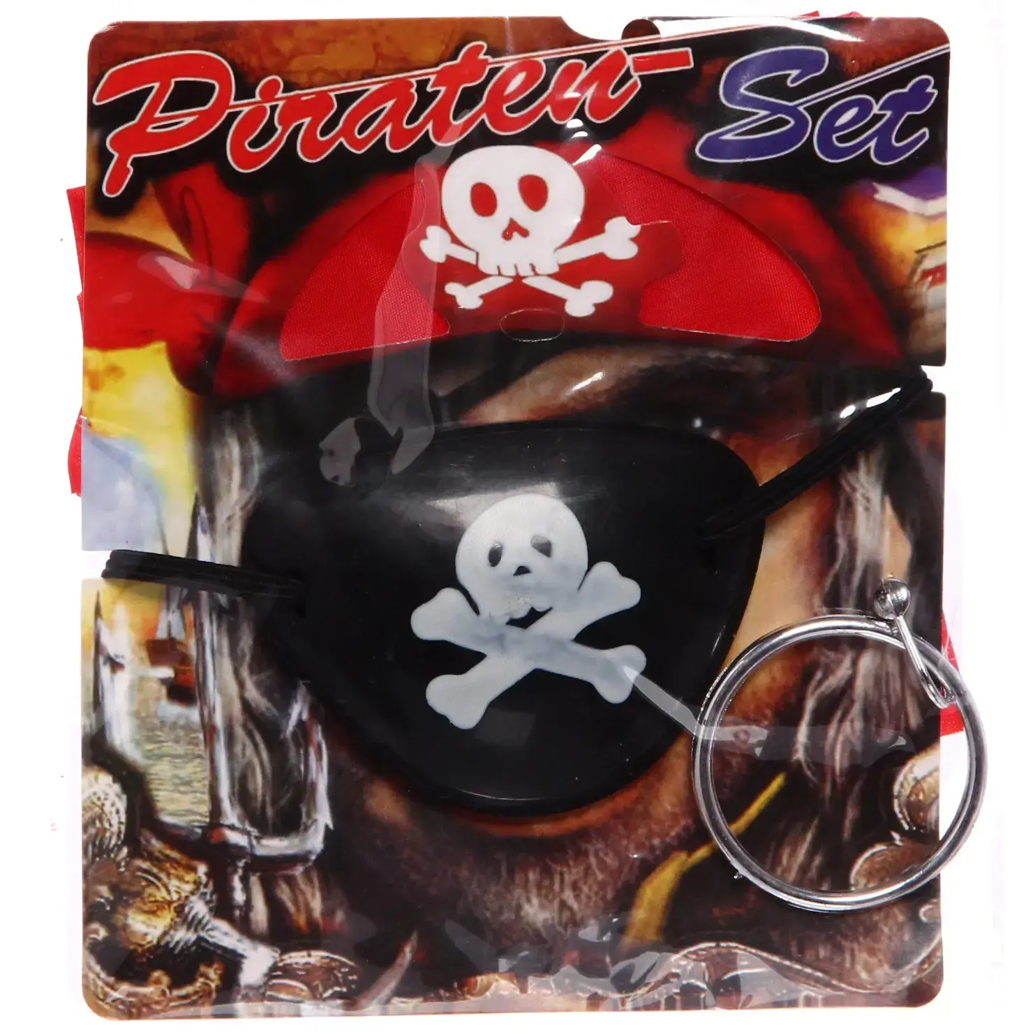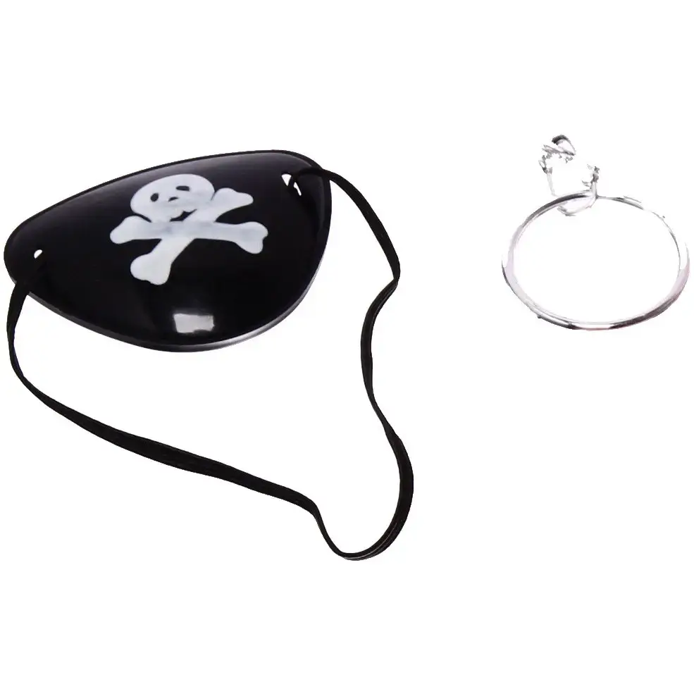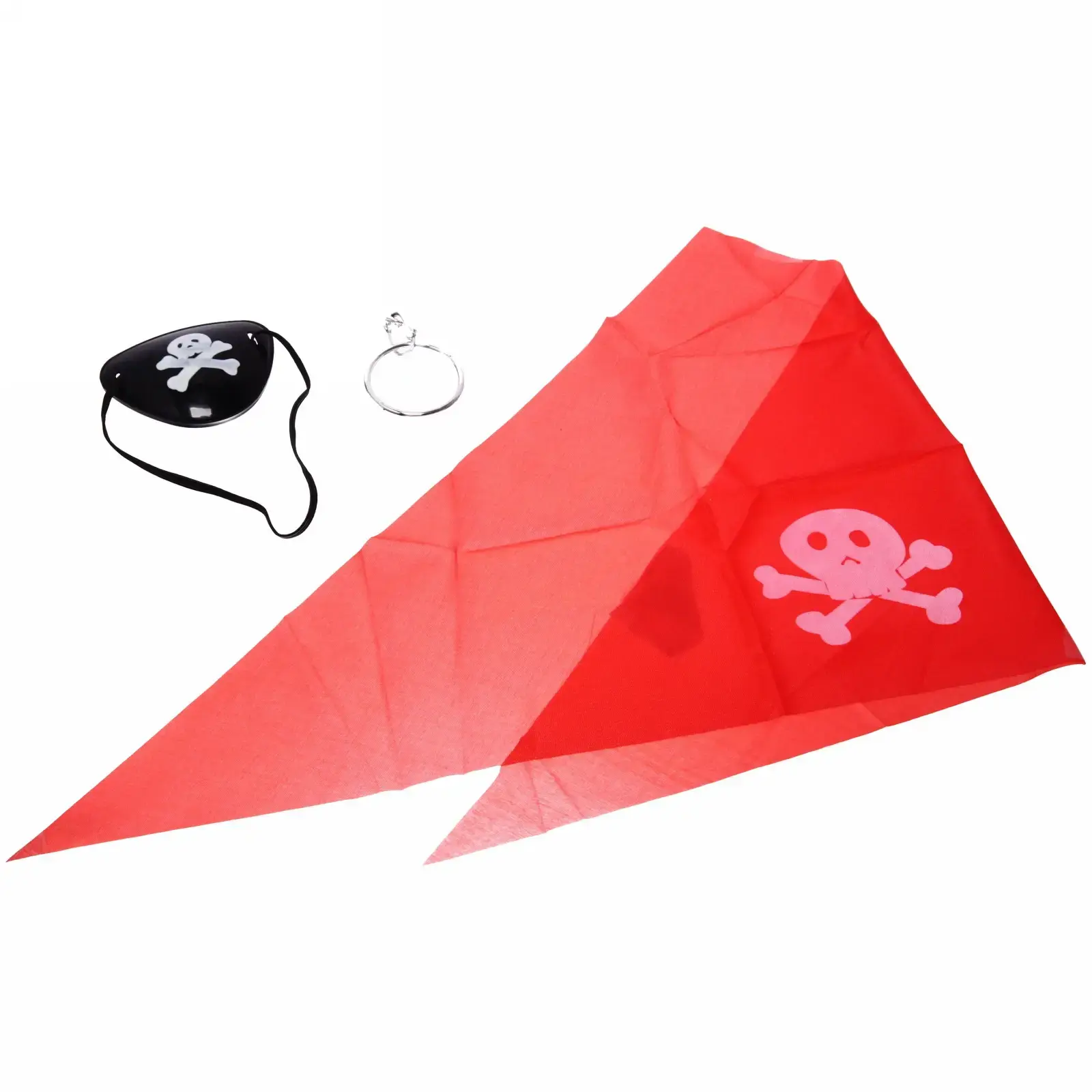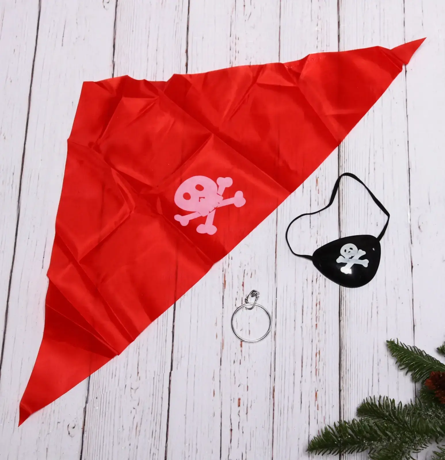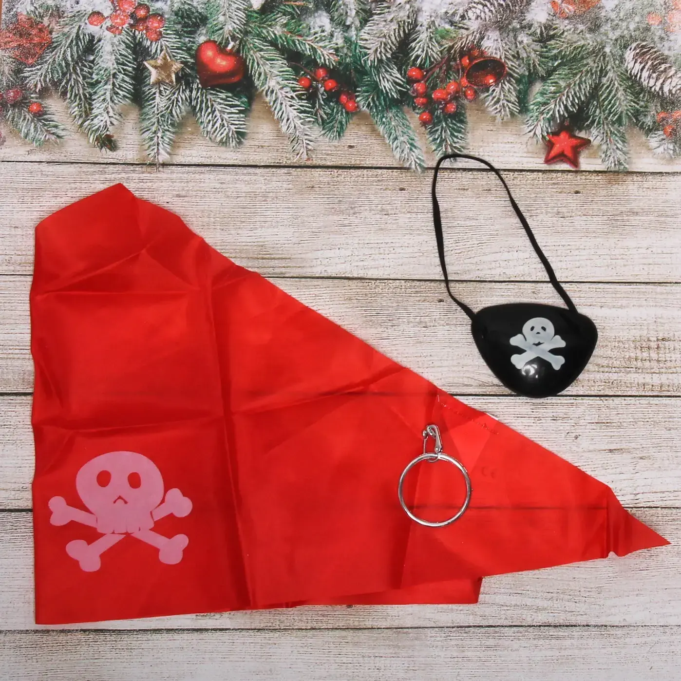 В набор входят три элемента: красная бандана, черная повязка на глаз и металлическая серьга. Бандана выполнена из текстиля и украшена изображением черепа с костями, что придаёт ей аутентичный вид. Повязка на глаз также декорирована тем же символом и имеет эластичную резинку для удобной фиксации. Металлическая серьга завершает образ и добавляет нотку приключений.