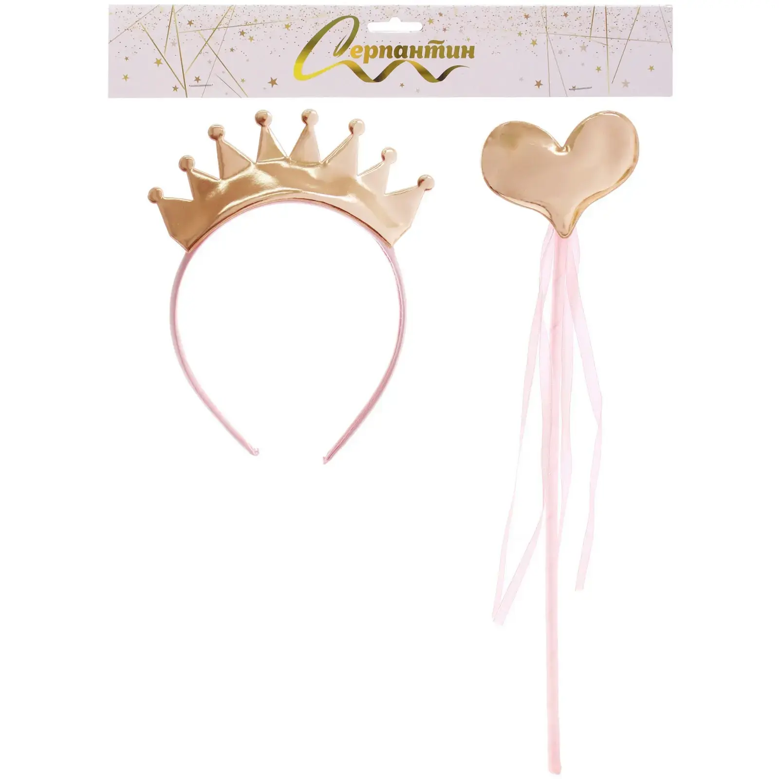 Ободок выполнен в золотистом цвете с короной, украшенной маленькими выступами, а палочка имеет золотистое сердечко на верхнем конце. Эти аксессуары легко комбинируются с различными нарядами, позволяя создавать уникальные образы. Не упустите возможность сделать ваш праздник незабываемым с набором карнавальных аксессуаров «Сказочный мир»!
