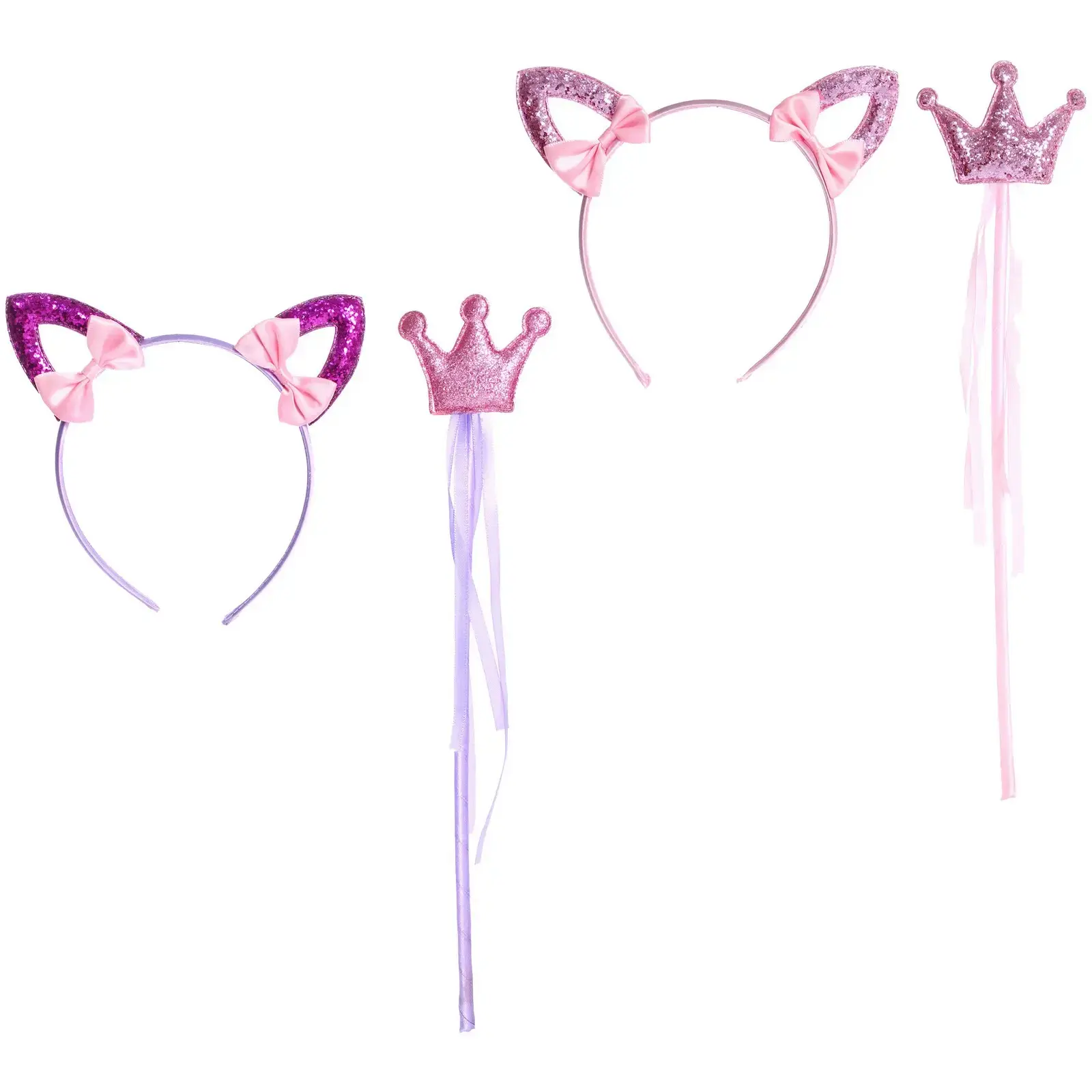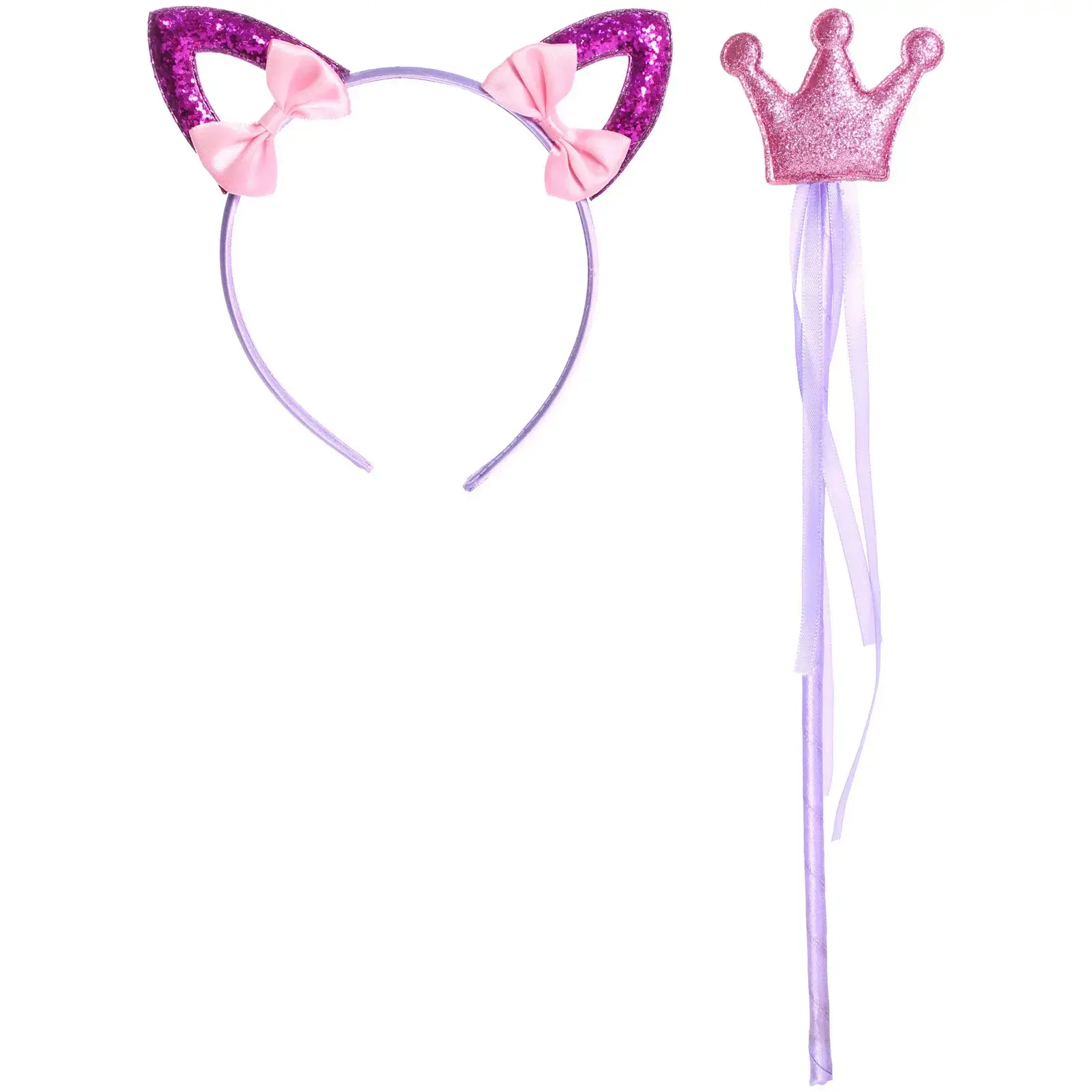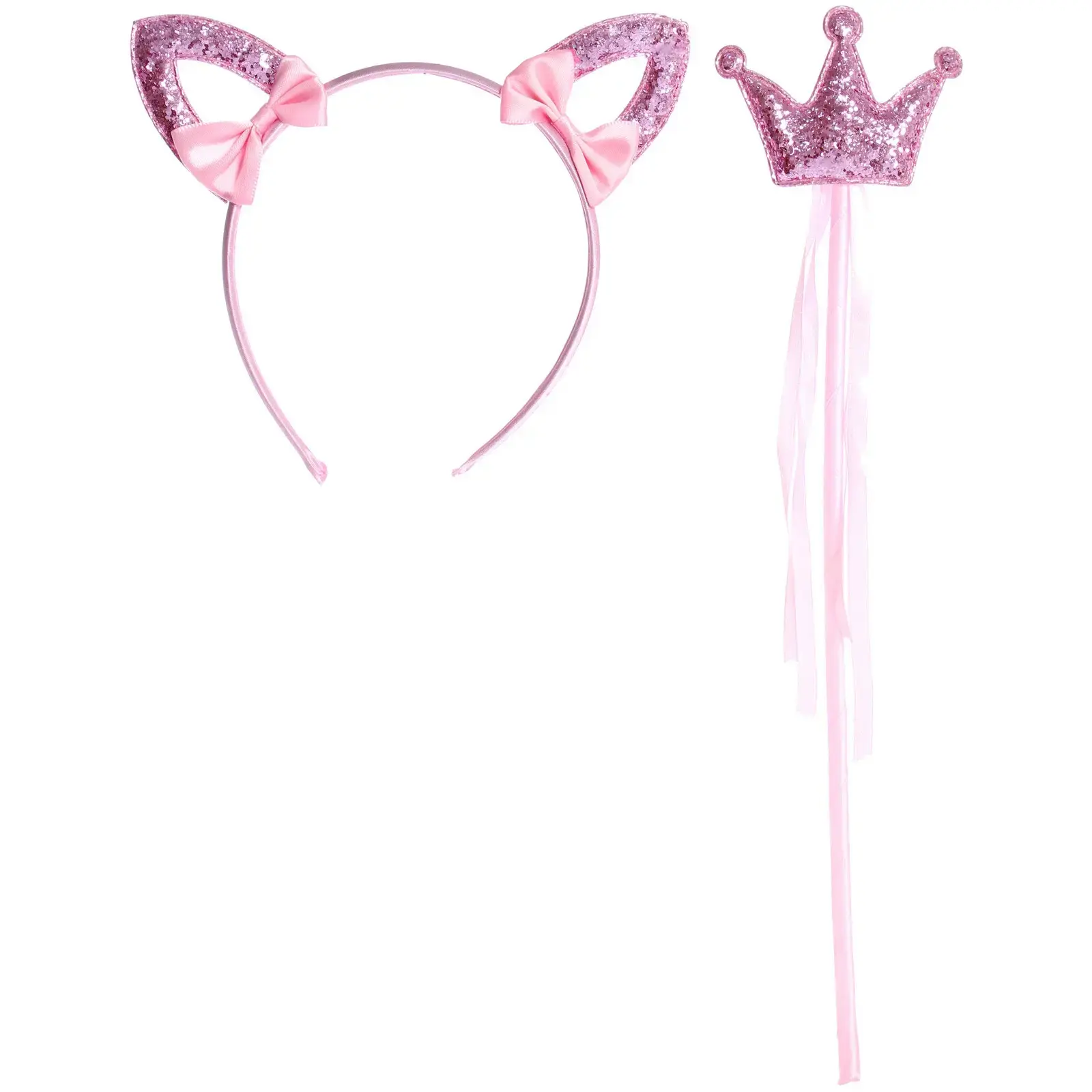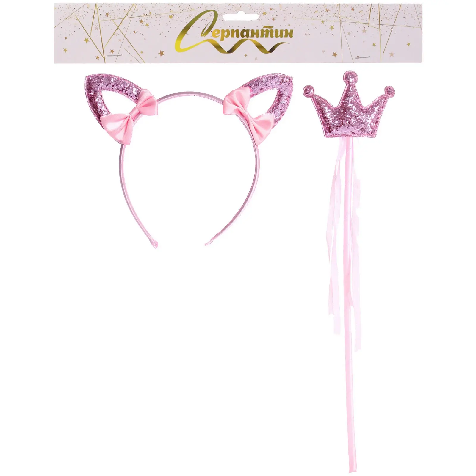 Ободок имеет розовый цвет с блестящими ушками и двумя розовыми бантиками, а волшебная палочка украшена короной и длинными лентами. Все элементы набора выполнены в ярких и привлекательных цветах, что делает их идеальными для детских праздников. Размеры ободка и палочки подходят для детей, что обеспечивает комфортное ношение.