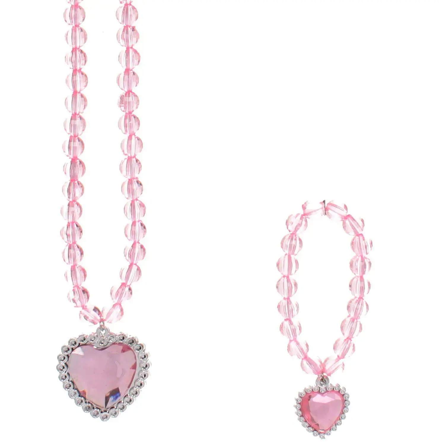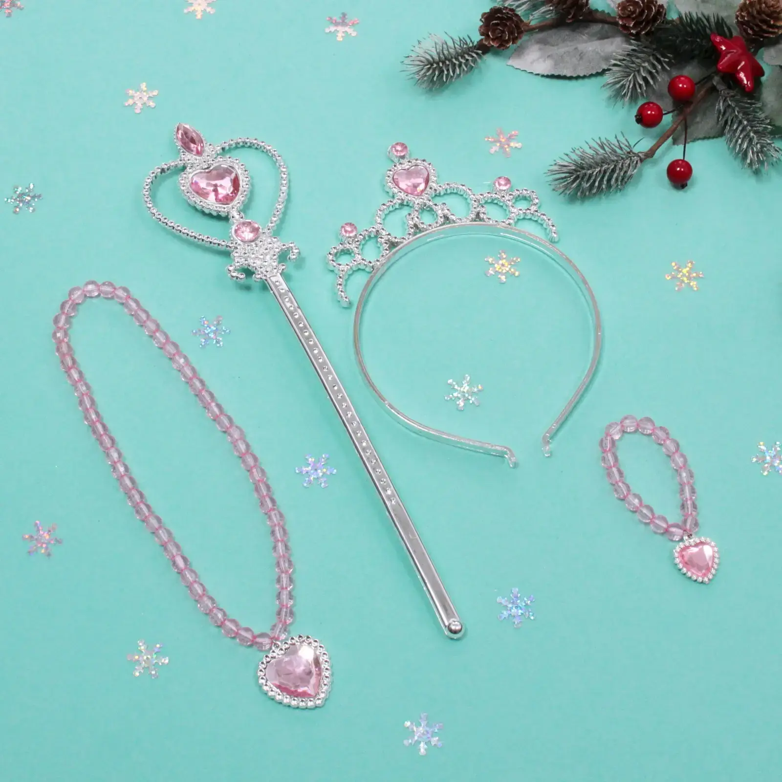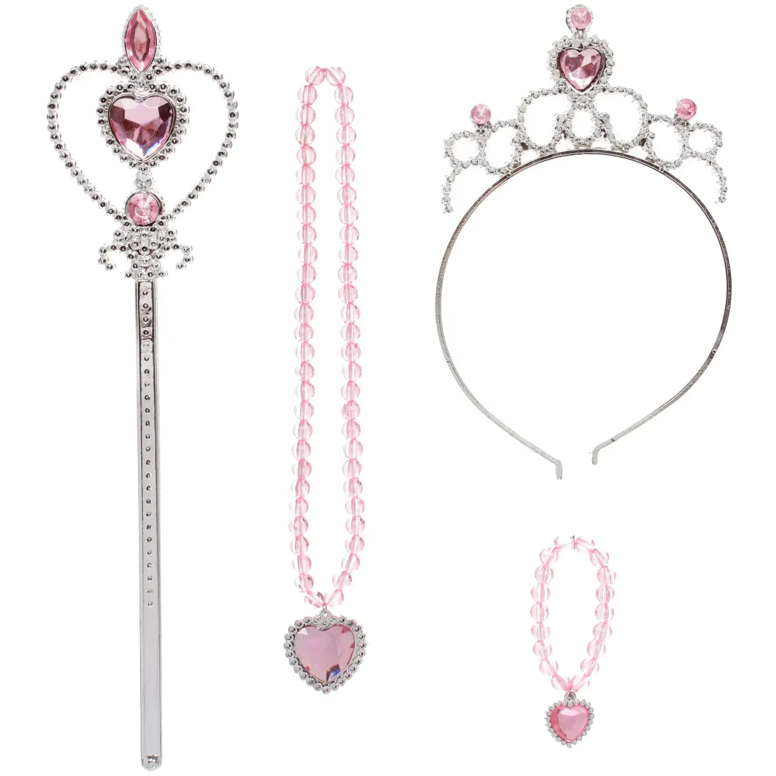 Все элементы набора выполнены из пластика, что делает их легкими и безопасными для детей. Ободок украшен стразами, а палочка имеет декоративный элемент в виде сердца, что придаёт ей особый шарм. Ожерелье и браслет также оформлены в розовых тонах с сердечками, что делает их идеальными для завершения образа. Размеры и точные характеристики не указаны, но все аксессуары подходят для детей и легко комбинируются друг с другом.