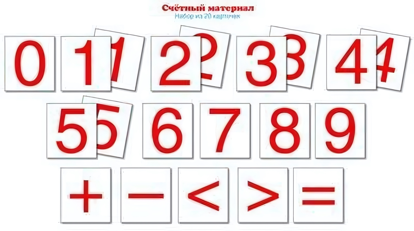 Каждая карточка имеет размер 50х55 мм – оптимальный формат для детского восприятия. Чёткий шрифт и контрастные цвета обеспечивают комфортное использование. В комплект входят все цифры от 0 до 9 (с дублированием часто используемых чисел) и основные математические знаки (+, -, <, >, =).