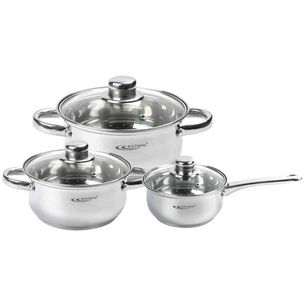 Кастрюли из пищевой нержавеющей стали не подвержены коррозии и сохраняют презентабельный вид годами. Комплект из 1.6л, 2.2л и 3.2л позволяет одновременно готовить гарниры, супы и соусы. Стеклянные крышки дают возможность контролировать процесс без потери тепла.