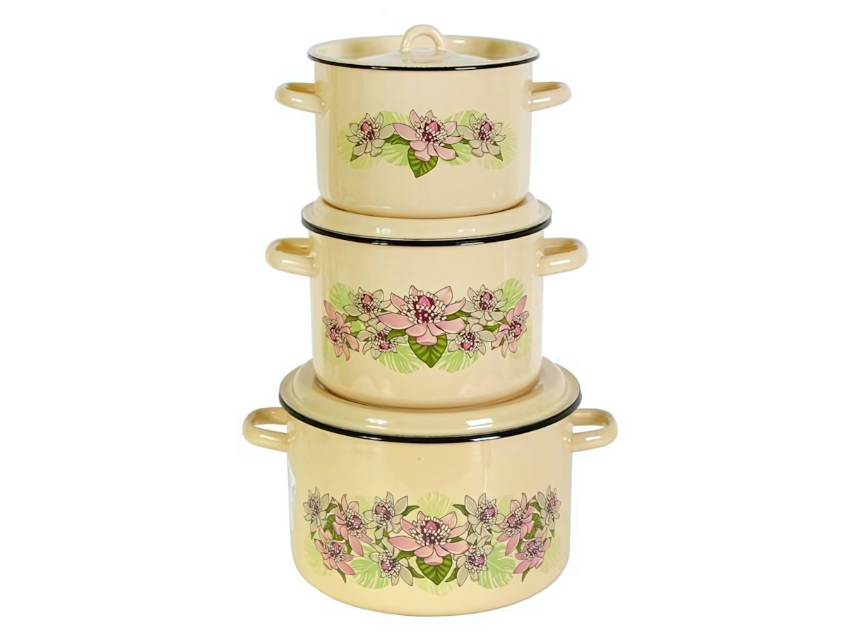 Этот набор кастрюль станет незаменимым помощником в приготовлении ваших любимых блюд. Элегантный дизайн с цветочным орнаментом добавит уют и стиль в вашу кухню, а высококачественное эмалированное покрытие обеспечит долговечность и легкость в уходе.