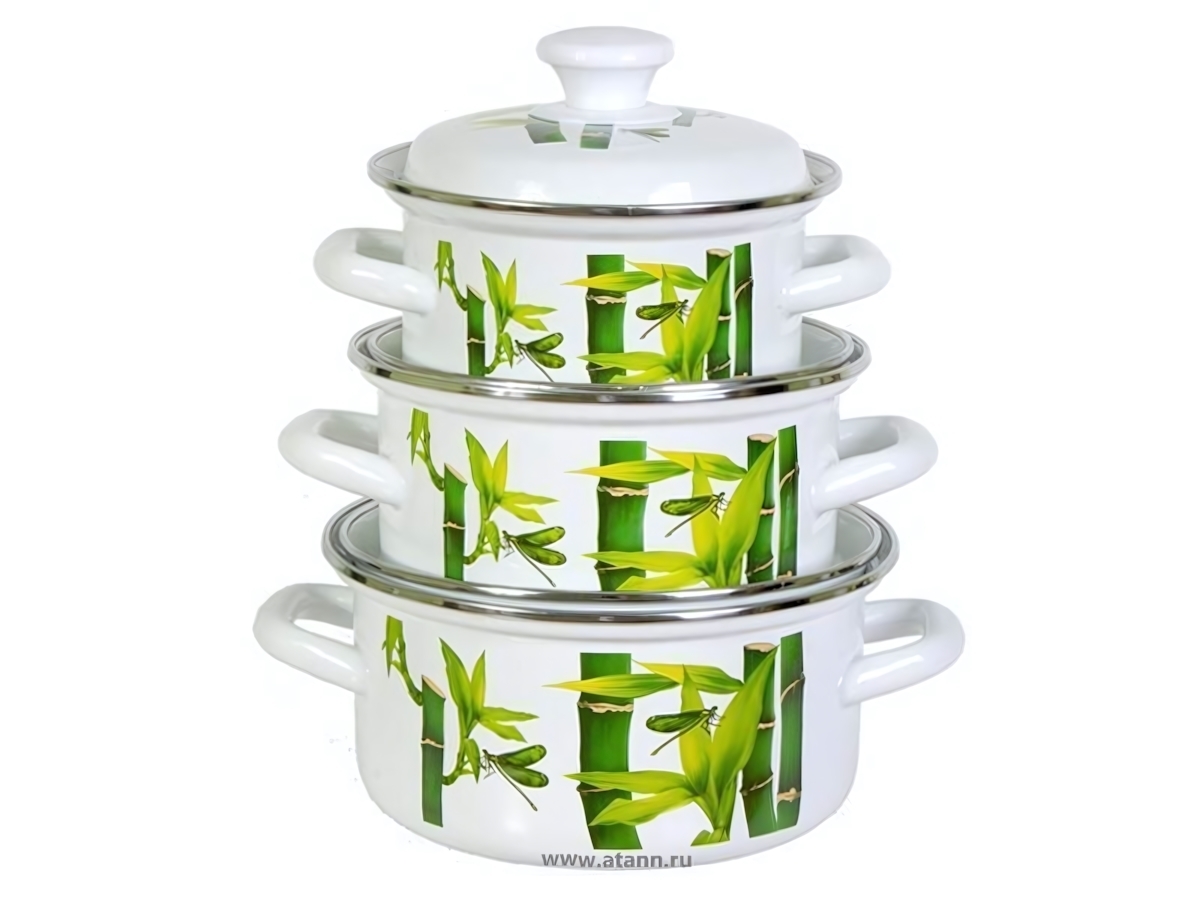Этот набор кастрюль станет незаменимым помощником в приготовлении ваших любимых блюд. Эстетичный дизайн с изображением бамбука и зелёных листьев добавит уют и стиль в вашу кухню. Кастрюли выполнены из эмалированной стали, что обеспечивает их долговечность и лёгкость в уходе.