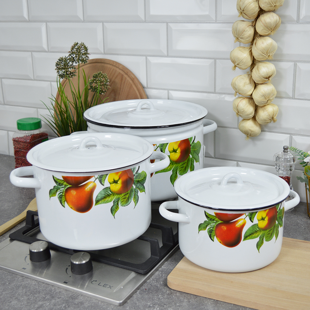 Набор включает кастрюли из стали с прочным эмалированным покрытием и металлическими крышками. Яркий рисунок с яблоками сохраняет насыщенные краски даже после многолетнего использования. Такой комплект будет уместным как для ежедневной готовки, так и для праздничных блюд.