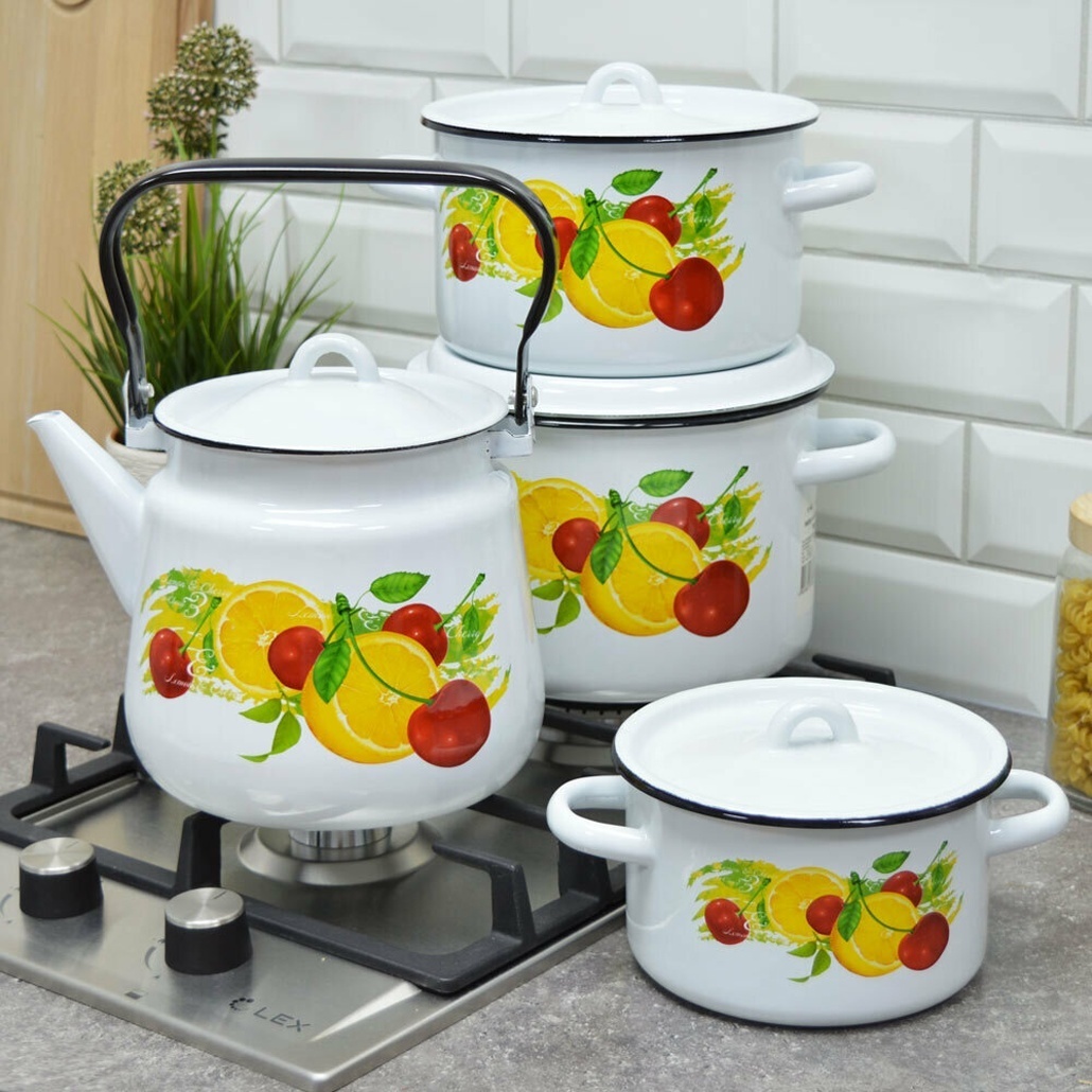 Набор кастрюль «Фрутта» с чайником, эмалированная сталь, 4 предмета (1,5л, 2,9л, 4,5л + 3,5л)