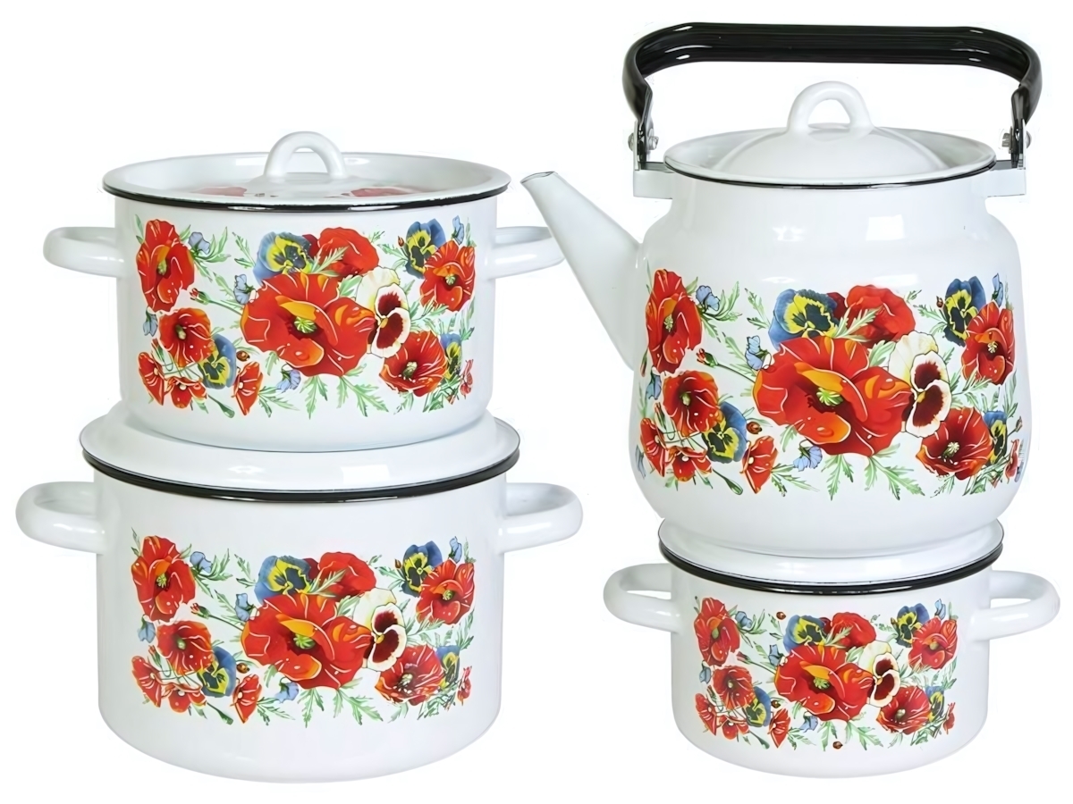 Набор кастрюль «Маки мечта» с чайником, 4 предмета, эмаль, цветочный декор