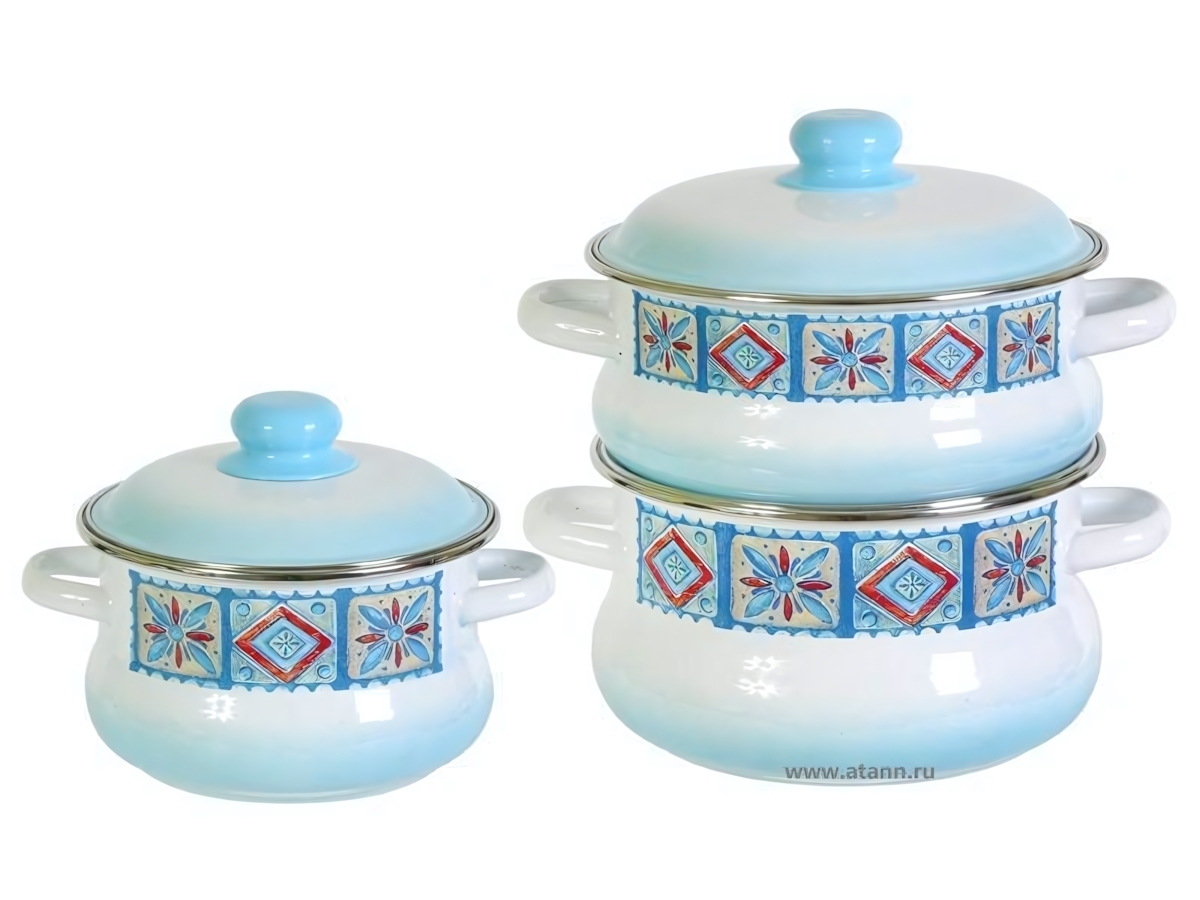 Эмалированное покрытие устойчиво к механическим повреждениям и не впитывает запахи. Кастрюли изготовлены из качественной стали, что гарантирует длительный срок службы. Благодаря универсальному дизайну с бело-голубым градиентом и цветочным орнаментом, посуда украсит любую кухню.