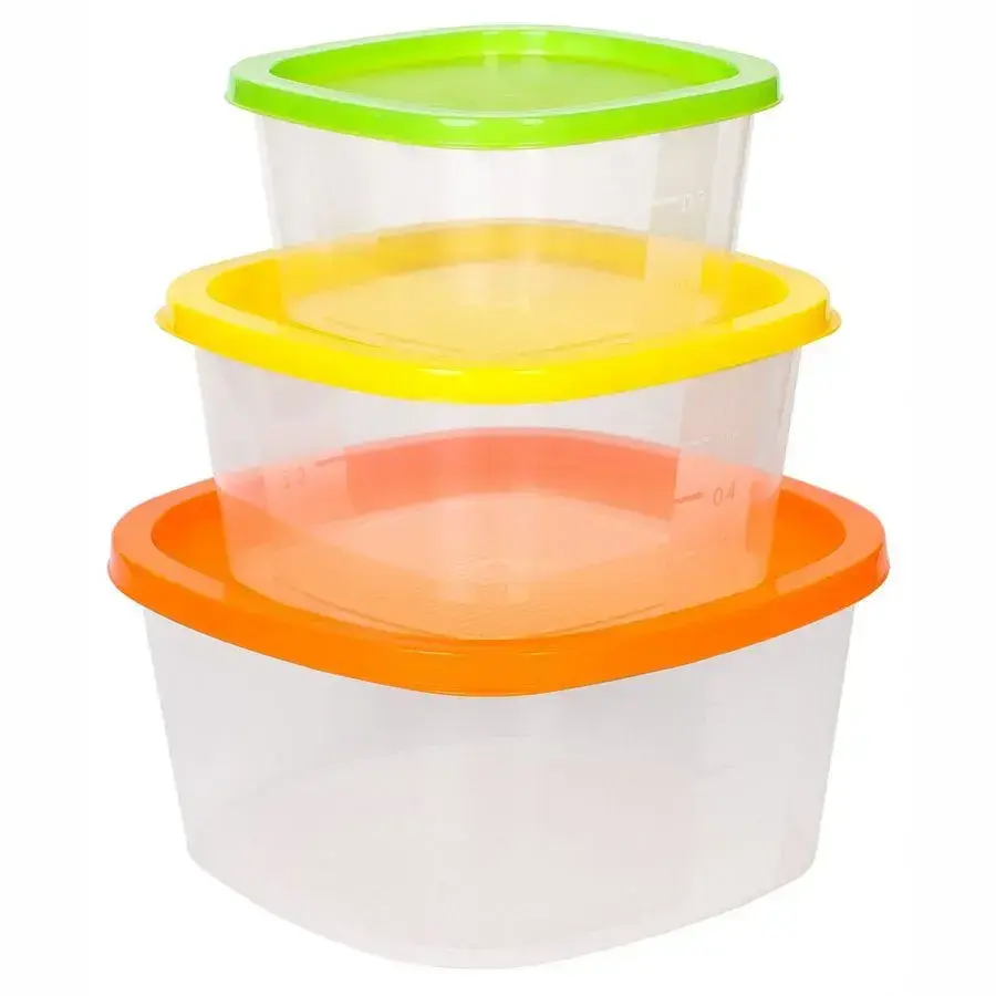 Практичный набор из трёх квадратных контейнеров с герметичными крышками создан для тех, кто ценит порядок на кухне. Прозрачные стенки позволяют быстро найти нужный продукт, а разноцветные крышки добавляют ярких акцентов в интерьер.