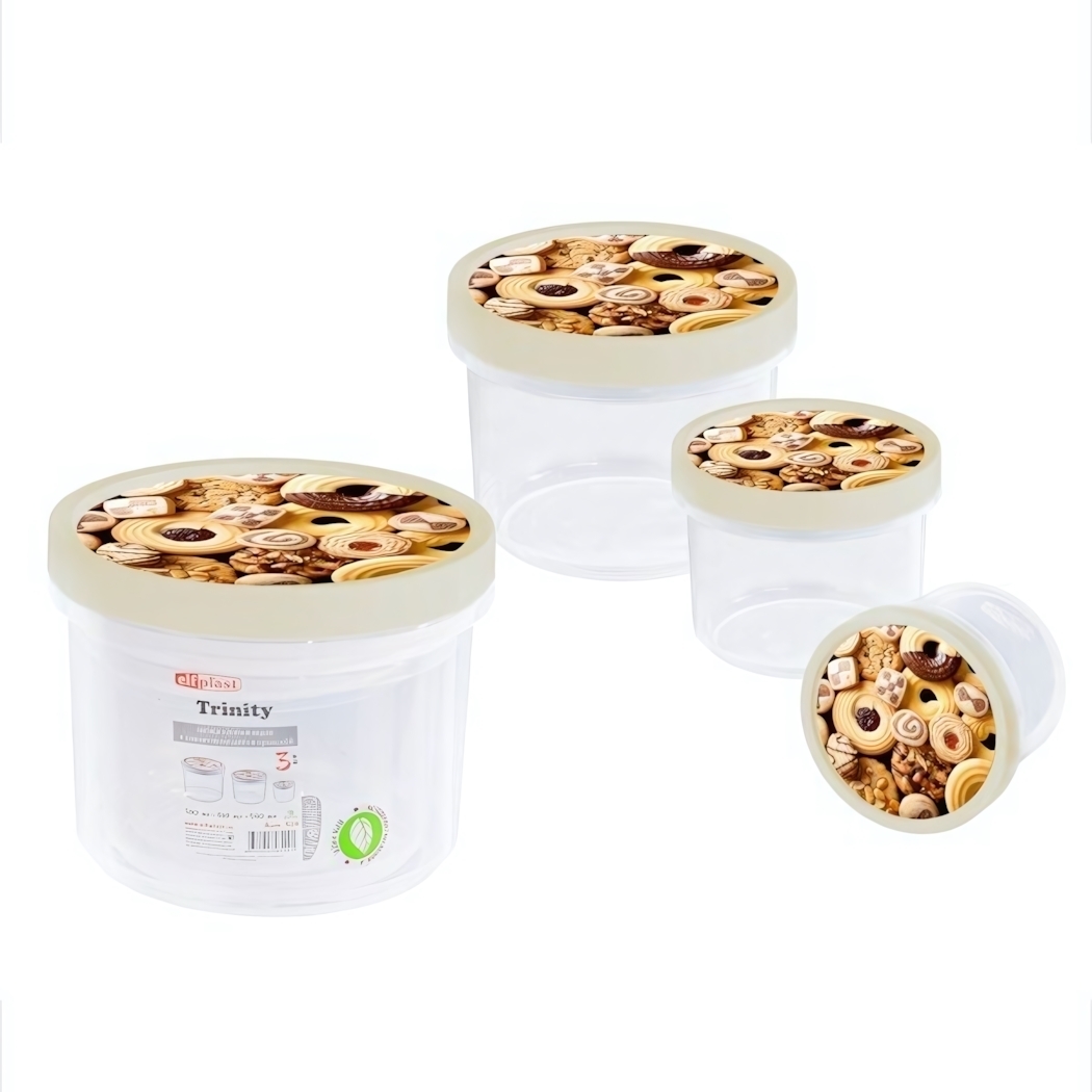 Набор контейнеров с завинчивающейся крышкой 'Trinity' — это идеальное решение для хранения продуктов и мелочей на вашей кухне. Эти контейнеры обеспечивают надежное хранение и защиту от влаги, что позволяет сохранить свежесть ваших любимых продуктов. Прозрачный материал позволяет легко видеть содержимое, а стильный дизайн с изображением печений и сладостей добавляет эстетики на вашу кухню.