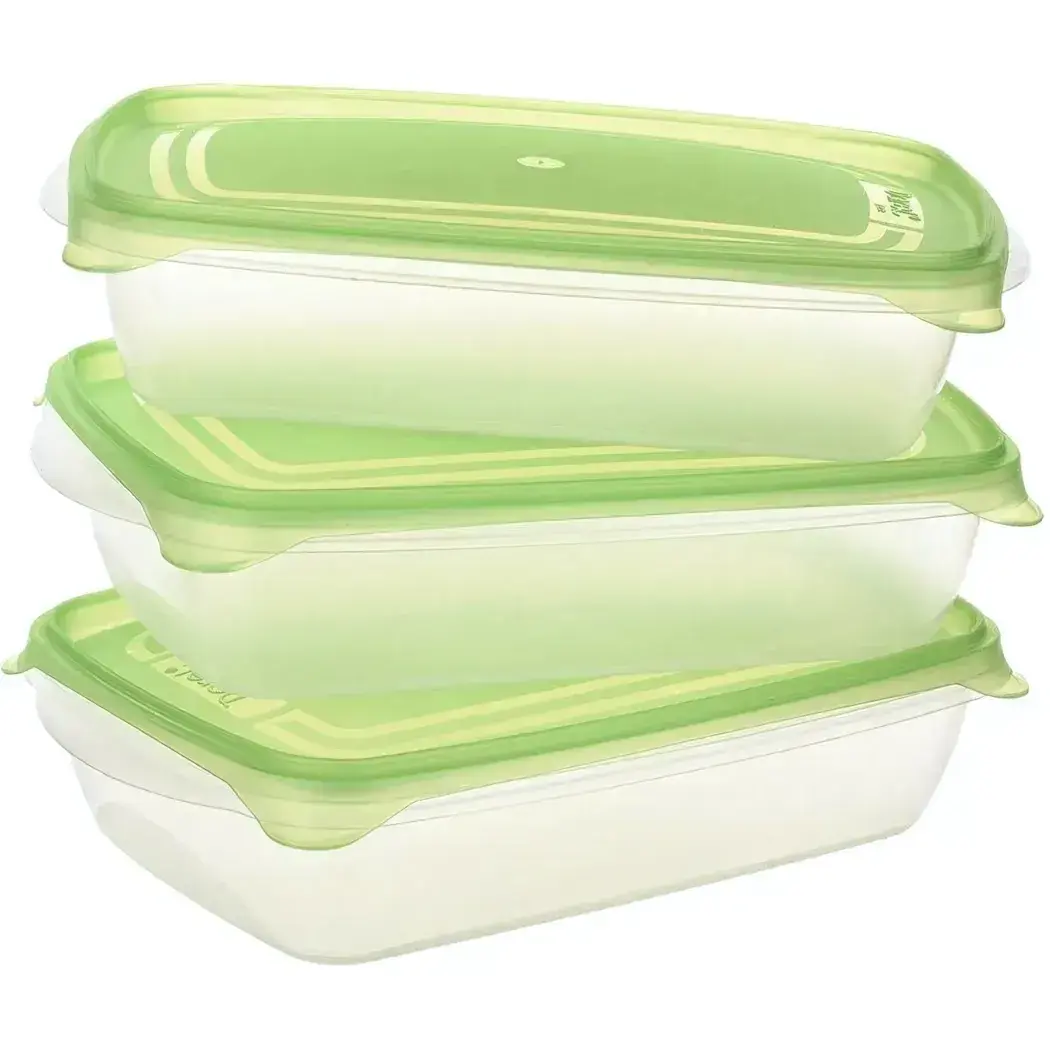 Набор контейнеров для пищевых продуктов, 1.3л, 3 штуки, прозрачные со зелеными крышками, пищевой пластик