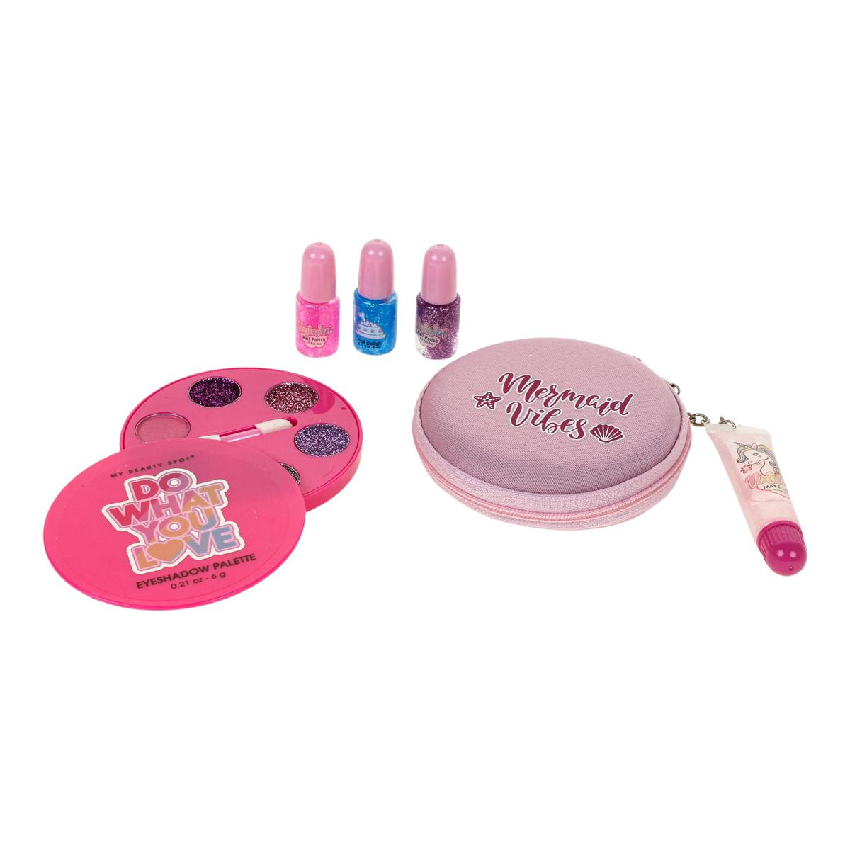 Косметичка выполнена в розовых тонах и украшена надписью "Mermaid Vibes", внутри предусмотрено место для хранения аксессуаров. Палетка имеет компактную круглую форму и прозрачную крышку, что делает использование удобным. Такой набор станет прекрасным сюрпризом на день рождения, праздник или просто без повода — чтобы порадовать маленькую принцессу и подарить ей моменты творчества и радости.