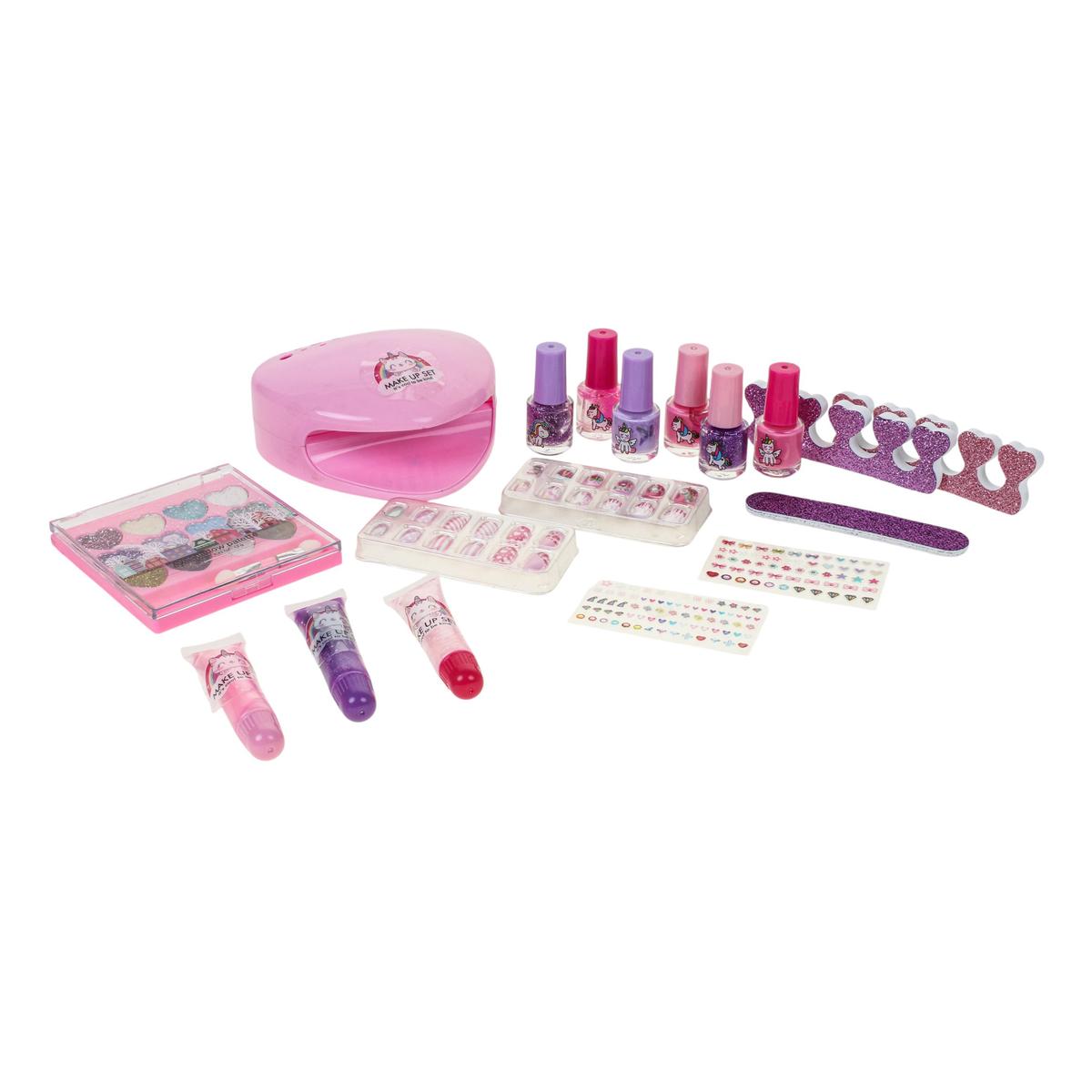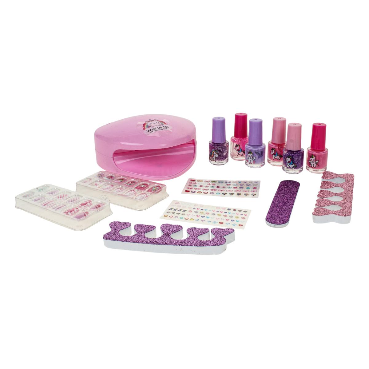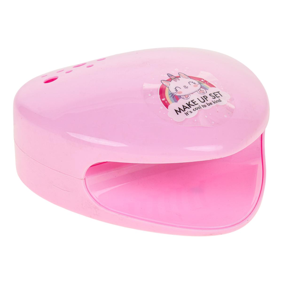 Ребёнок может самостоятельно придумывать сочетания цветов, украшать ногти наклейками и использовать накладные элементы для создания праздничного образа. Лампа для сушки ногтей помогает завершить маникюр, а палетка теней с блёстками и блеск для губ дополняют образ для выступлений, праздников или домашних показов мод.