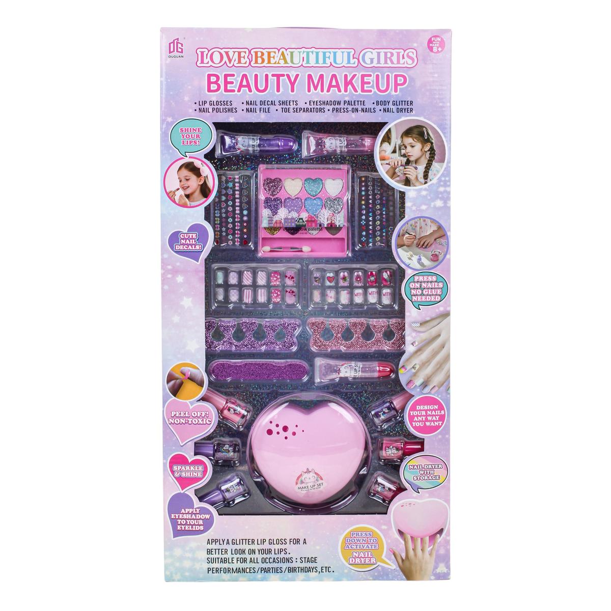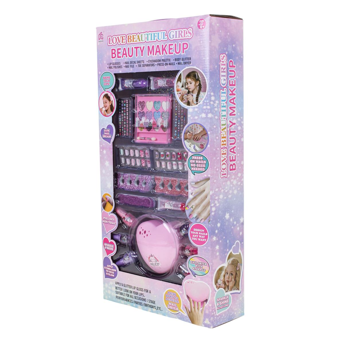 Набор поставляется в яркой коробке размером 29,5х10х57 см, которая подходит для хранения всех элементов после игры. Комплектация продумана так, чтобы ребёнок мог сразу приступить к созданию маникюра и макияжа без дополнительных аксессуаров. Отличный вариант подарка для девочки, которая любит косметику и творческие эксперименты.