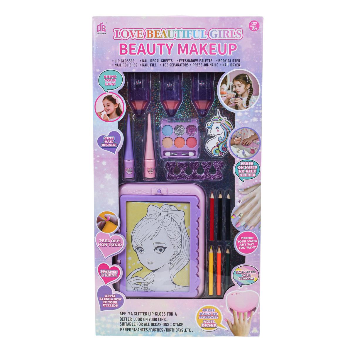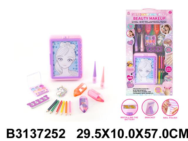 Набор упакован в коробку размером 29,5х10х57 см с прозрачным окном, через которое видно содержимое. Внутри представлены декоративная косметика и аксессуары для макияжа и маникюра, а также планшет с подставкой для удобной игры. Формат комплекта позволяет хранить все элементы вместе и поддерживать порядок после использования.