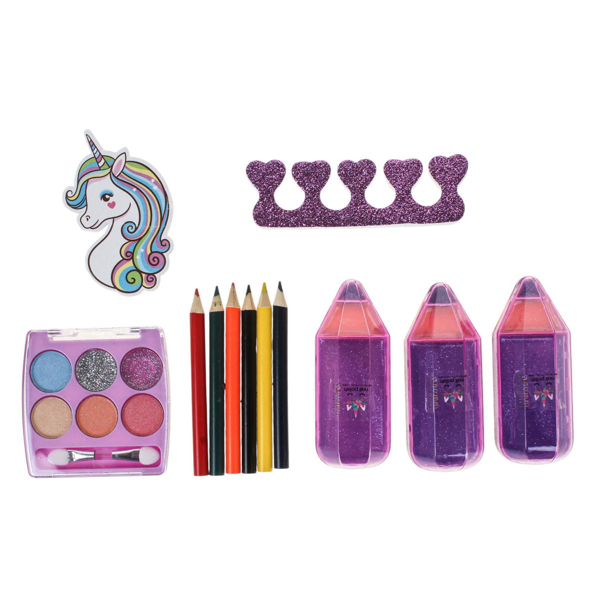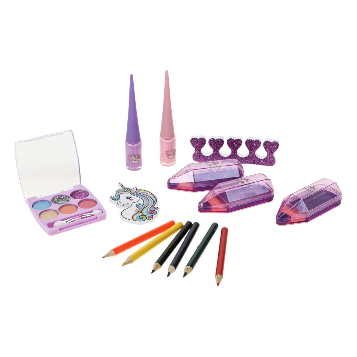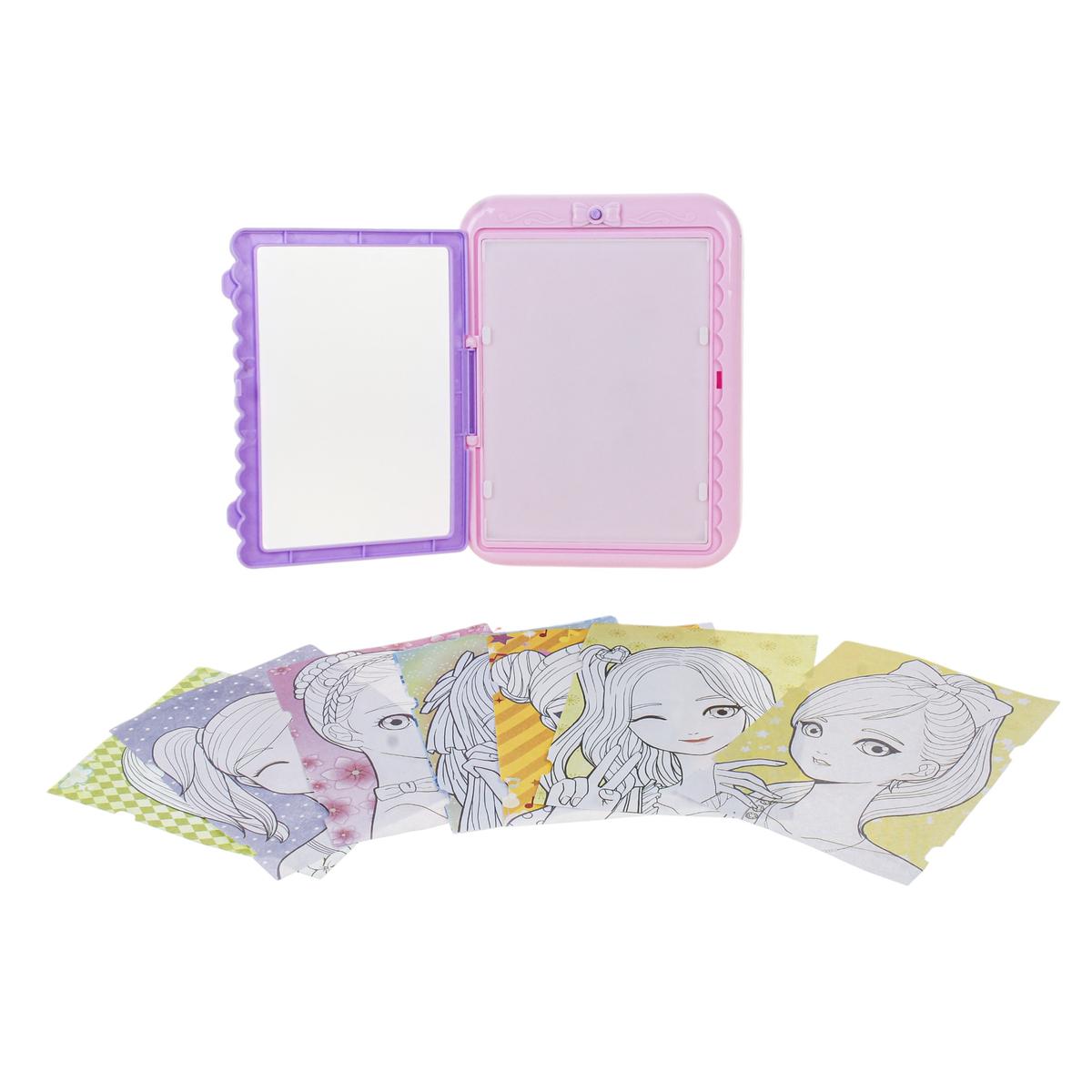 В комплект входят палетка теней с аппликатором, лаки для ногтей, блески для губ в формате карандашей, декоративные элементы и аксессуары для нейл-дизайна. Дополнительно предусмотрен планшет с карточками для тренировки макияжа — можно экспериментировать с цветами и сочетаниями, не нанося косметику сразу на лицо. Это удобный способ освоить базовые навыки и почувствовать уверенность.