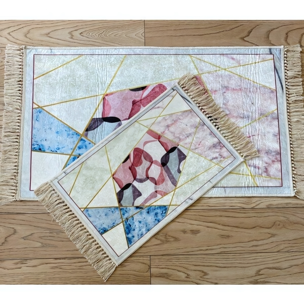 Изготовленные из качественного текстиля, коврики имеют оригинальный дизайн с цифровой печатью и бахромой по периметру. Размеры: 60x100 см и 40x60 см позволяют создать многослойный эффект или зонировать пространство. Их геометрический узор с золотыми линиями станет ярким акцентом в интерьере.