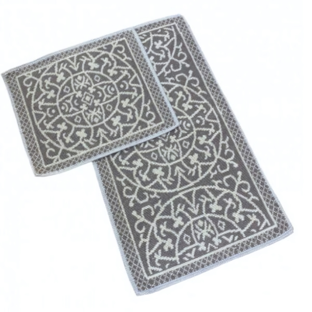 Хлопковый набор ковриков для ванной создан для тех, кто ценит мягкость под ногами и аккуратный, завершённый вид интерьера. Приятная текстура и плотное плетение обеспечивают комфорт после душа или ванны, а гармоничный серо-кремовый оттенок с орнаментом добавляет помещению уюта и визуальной аккуратности.