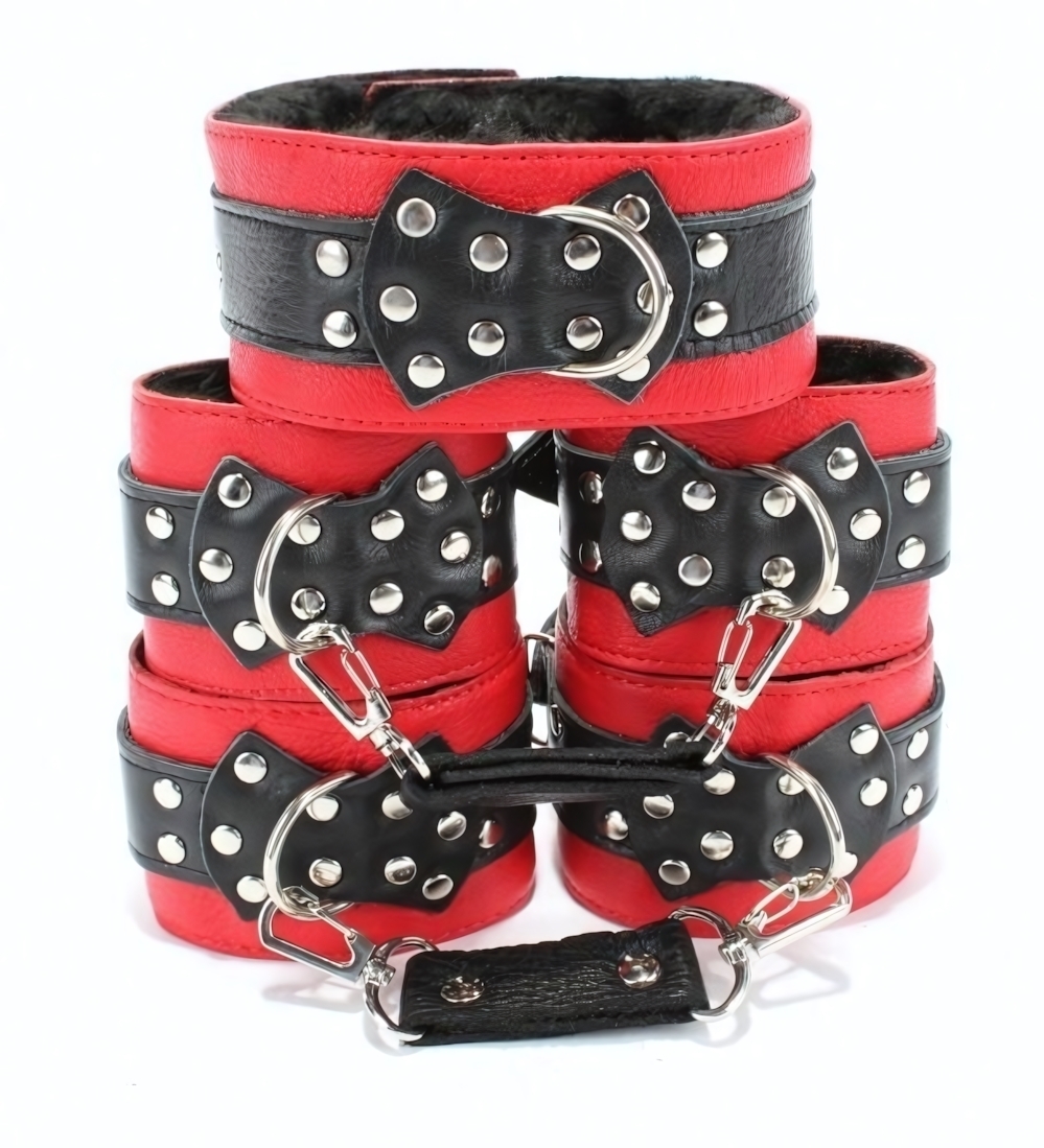 Набор фиксаторов BDSM с меховым подкладом для комфорта, натуральная кожа, регулируемые манжеты, красно-черный