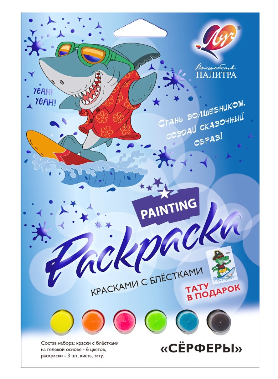 Набор для раскрашивания «Сёрферы» с блестками, 3 карточки, краски и кисть, + тату в подарок