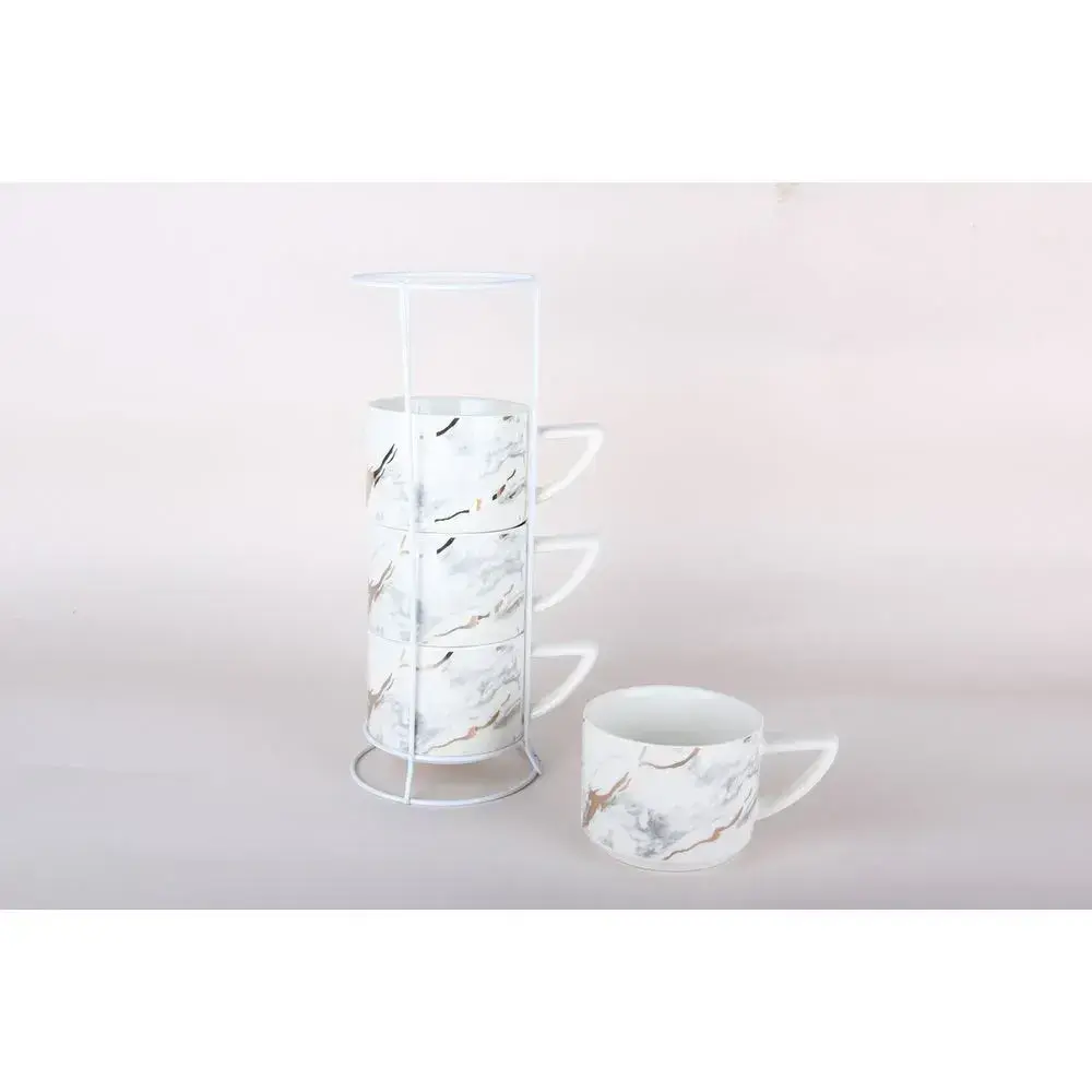 Каждая кружка имеет классическую цилиндрическую форму диаметром 8 см и высотой 9,5 см. Прочная металлическая подставка диаметром 11 см надёжно фиксирует посуду, предотвращая скольжение. Совместима с посудомоечной машиной и СВЧ-печью для вашего удобства.