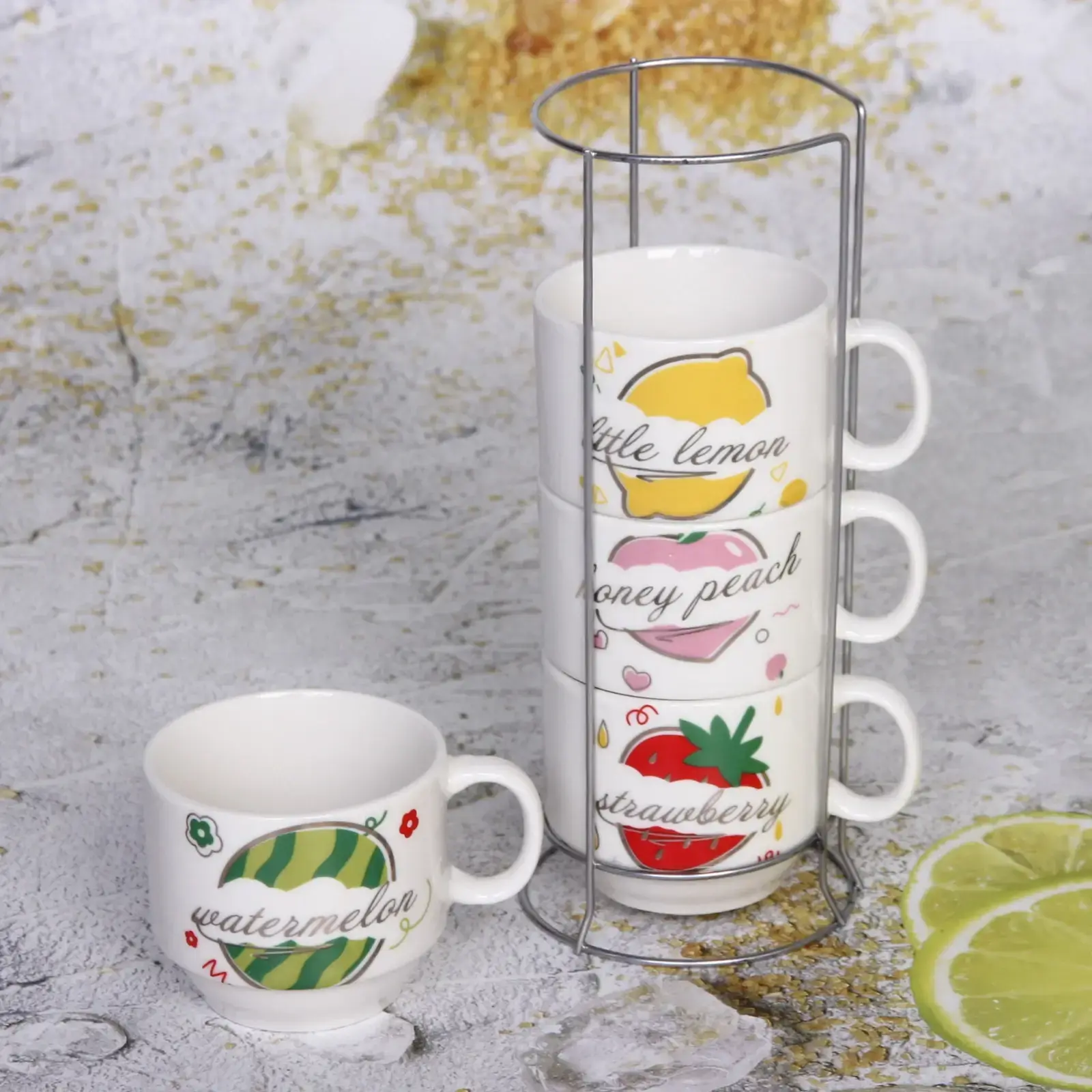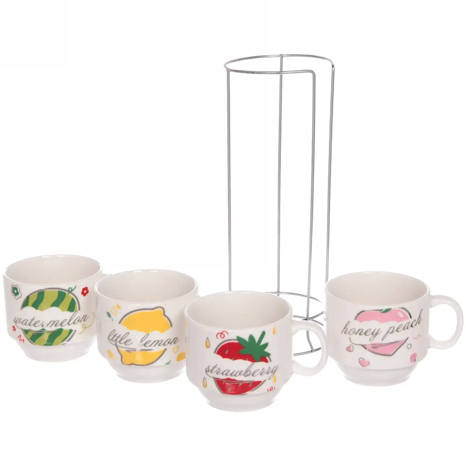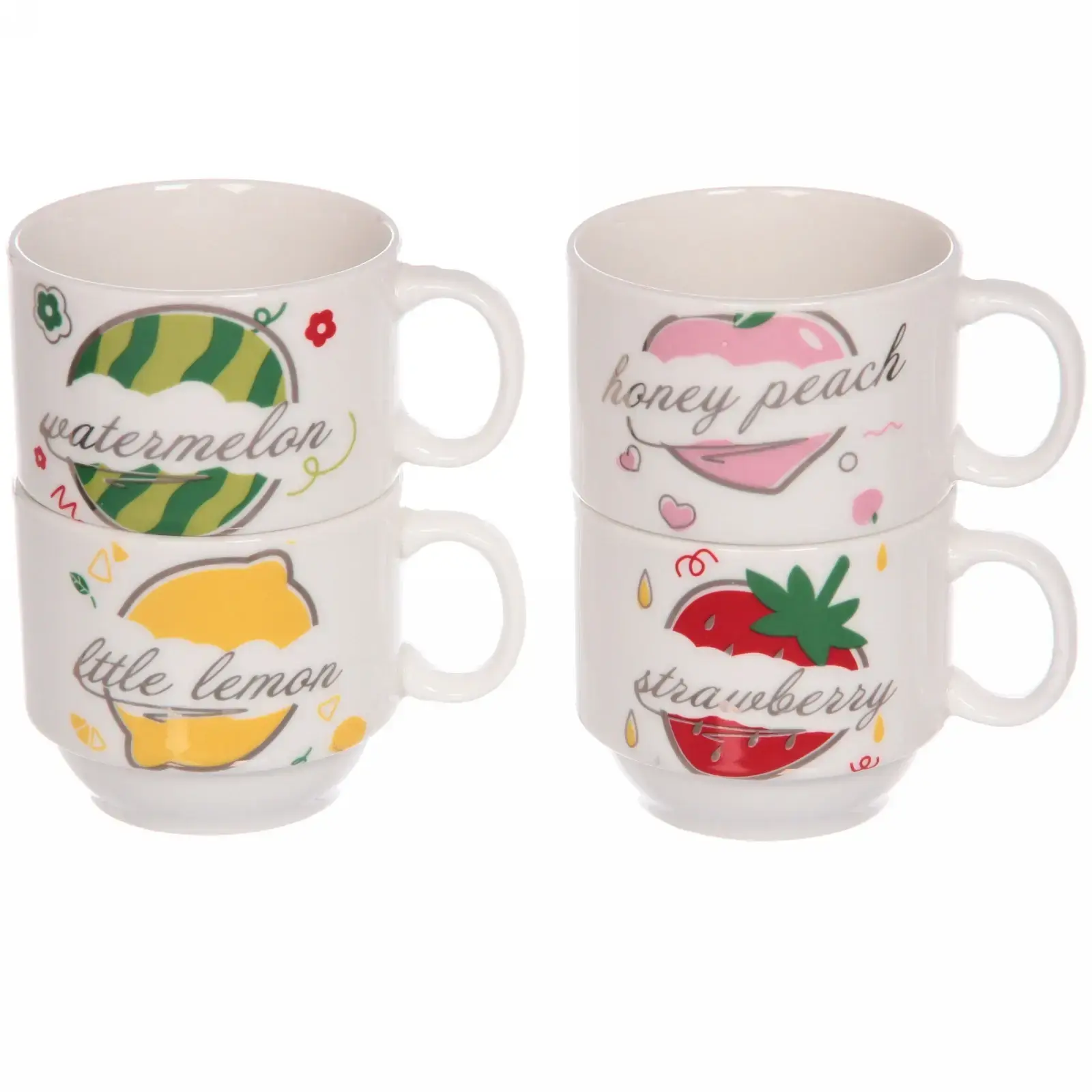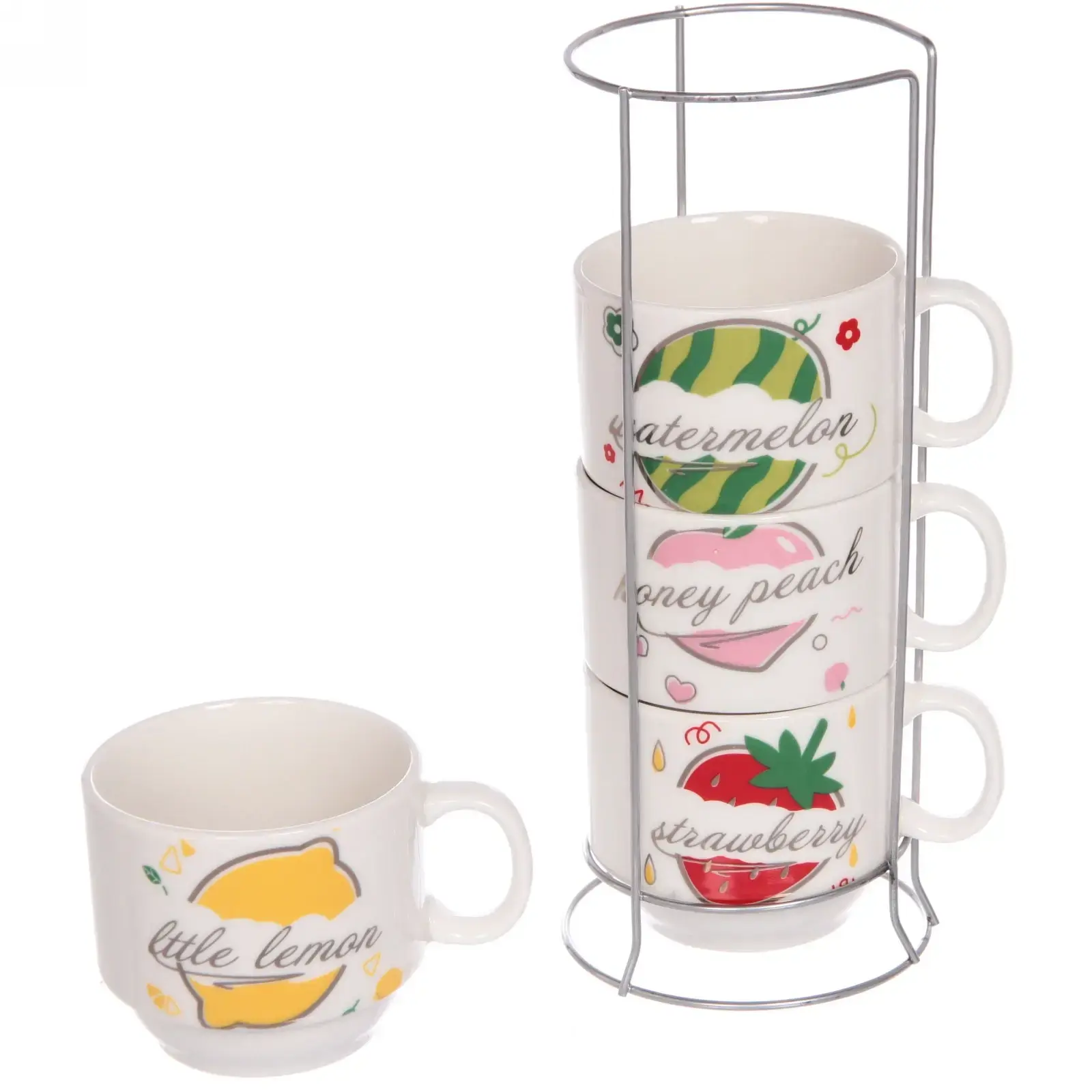 Набор из 4 керамических кружек с сочными фруктовыми принтами и практичной подставкой — это гармония стиля и функциональности. Каждая чашка украшена детализированными иллюстрациями арбуза, лимона, персика и клубники, которые создают летнее настроение даже в холодные дни.