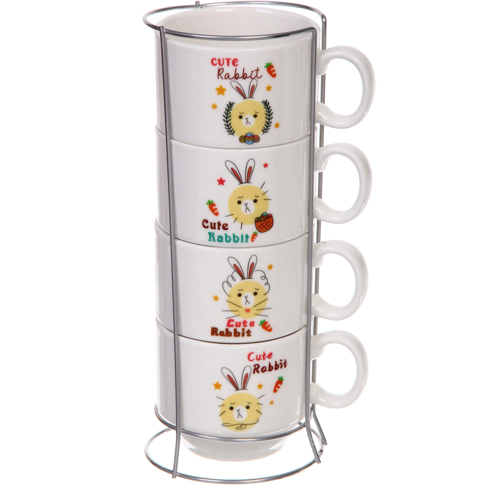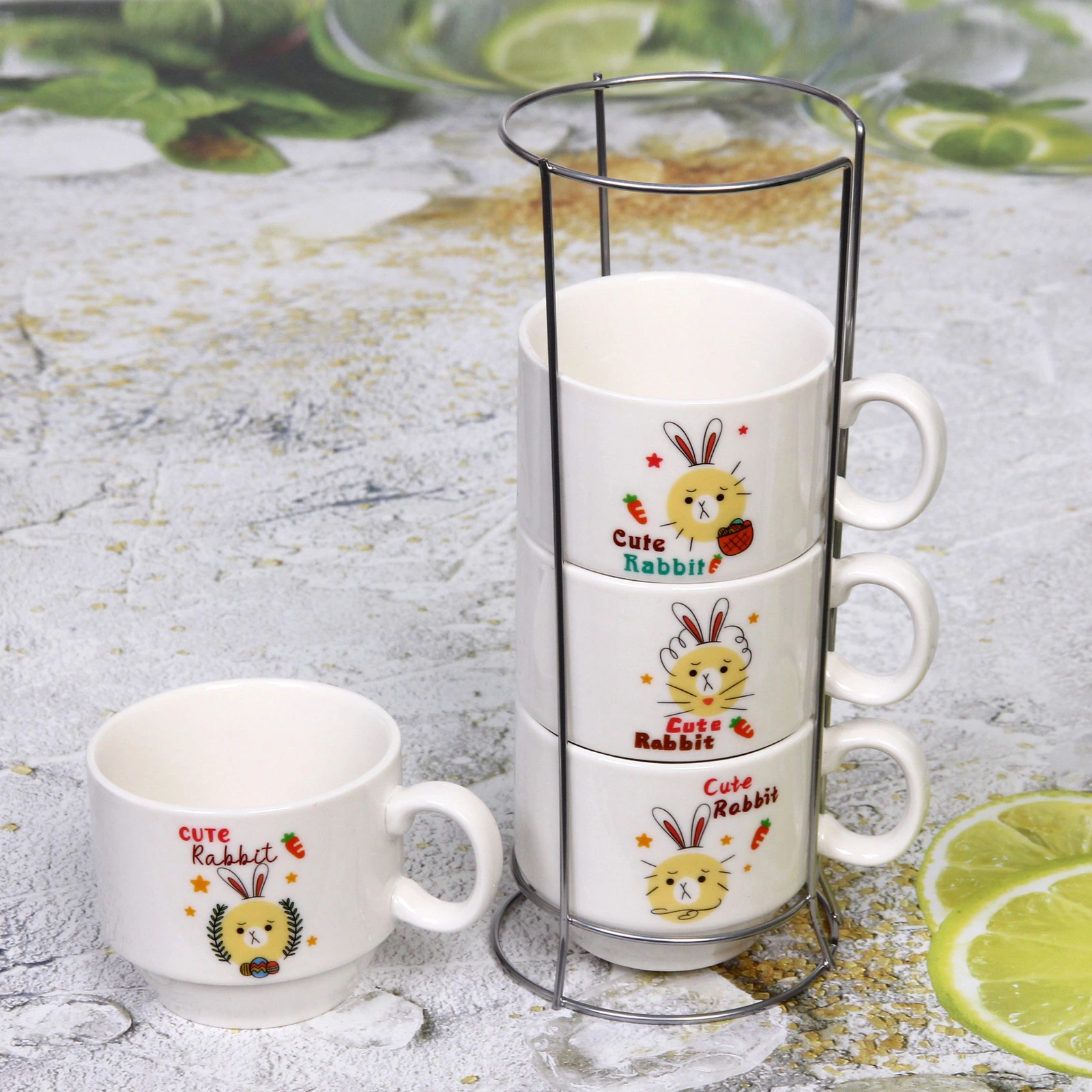 Добавьте тепла и настроения в повседневные моменты с очаровательным набором кружек на стойке. Нежные иллюстрации с кроликом и аккуратная подача на металлической подставке создают атмосферу уюта на кухне и делают сервировку более аккуратной и организованной.
