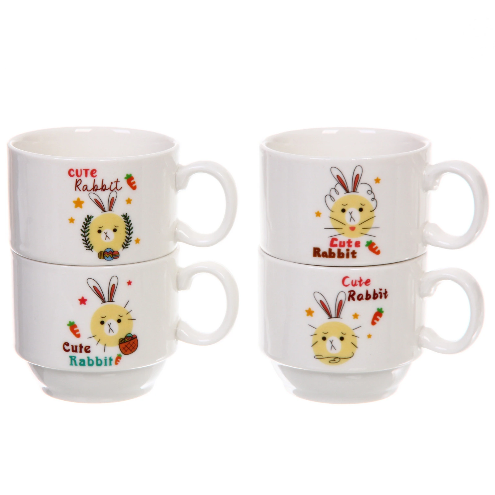 В комплект входят 4 керамические кружки объемом 200 мл и металлическая стойка для компактного хранения. Кружки удобно ставятся одна на другую благодаря продуманной форме с уступом в нижней части. Подставка помогает экономить место на столешнице и поддерживать порядок в шкафу или на открытой полке.