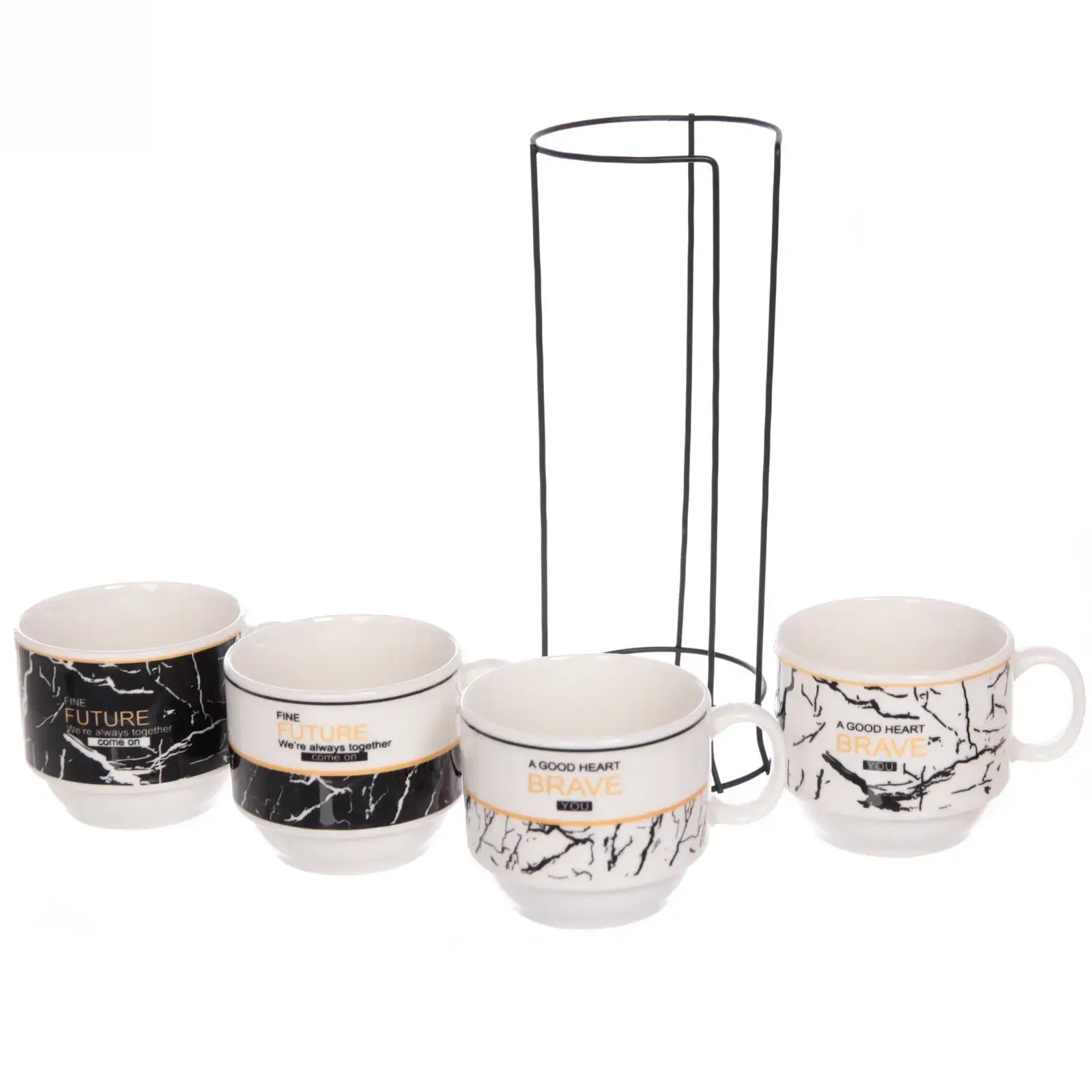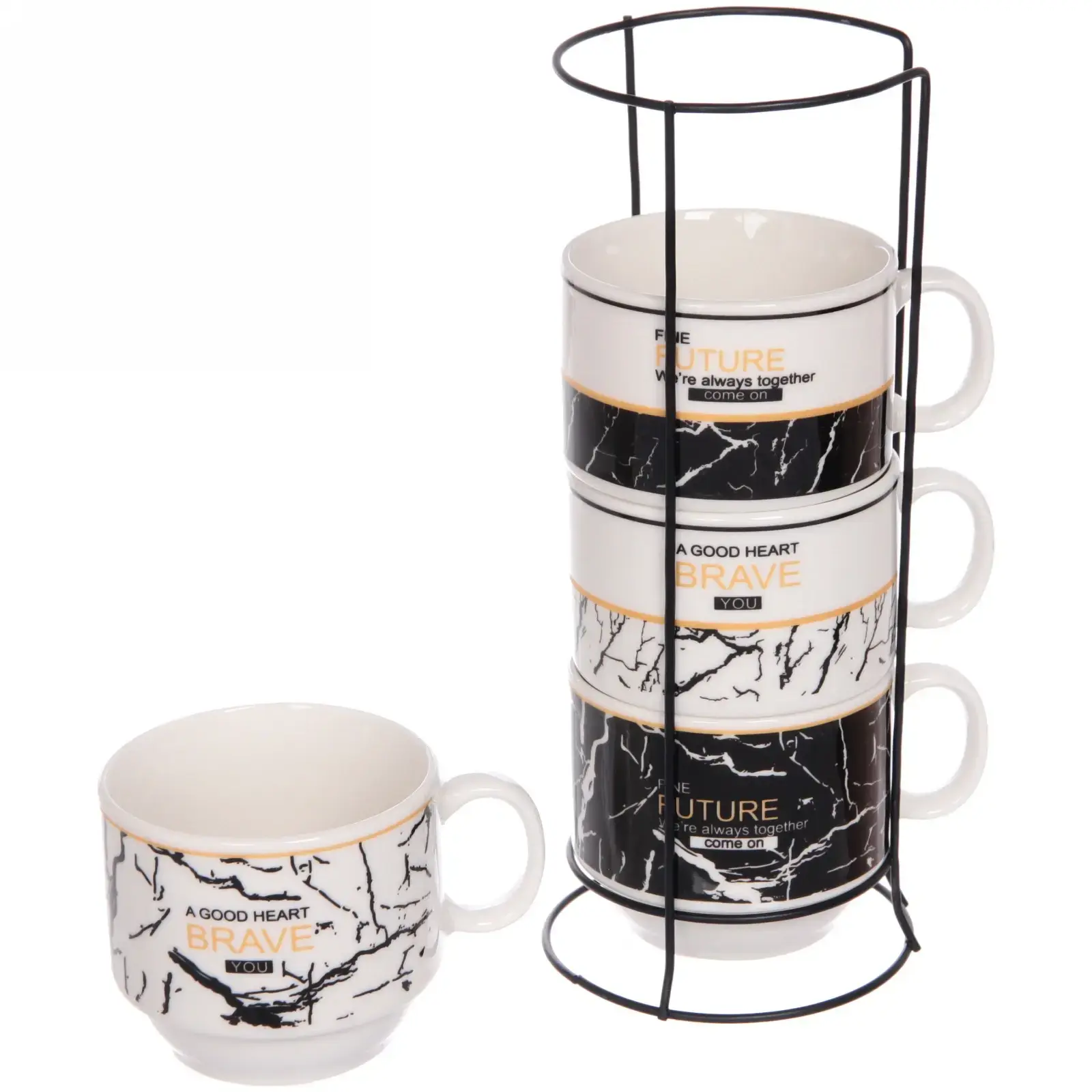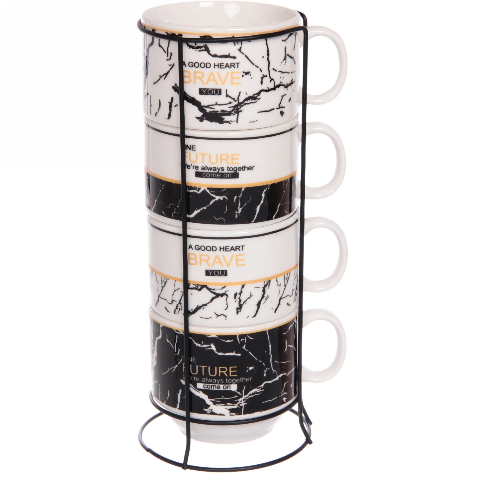 Набор включает четыре кружки, аккуратно размещенные на металлической стойке, что позволяет удобно хранить их и демонстрировать. Стойка черного цвета добавляет современный акцент, а вертикальное размещение кружек экономит пространство на столе. Эти кружки идеально подходят для подачи чая, кофе или других напитков, а также могут стать стильным элементом декора.