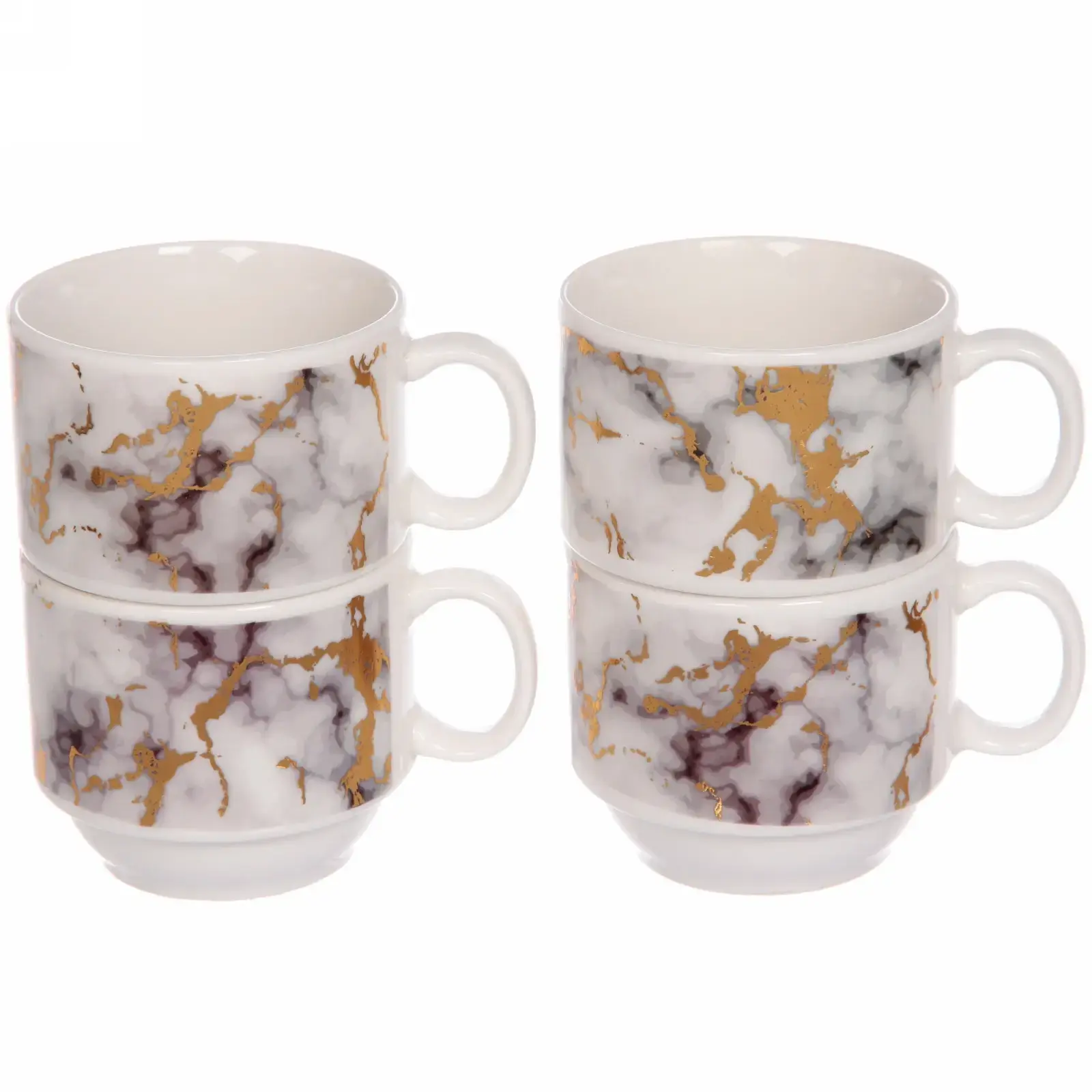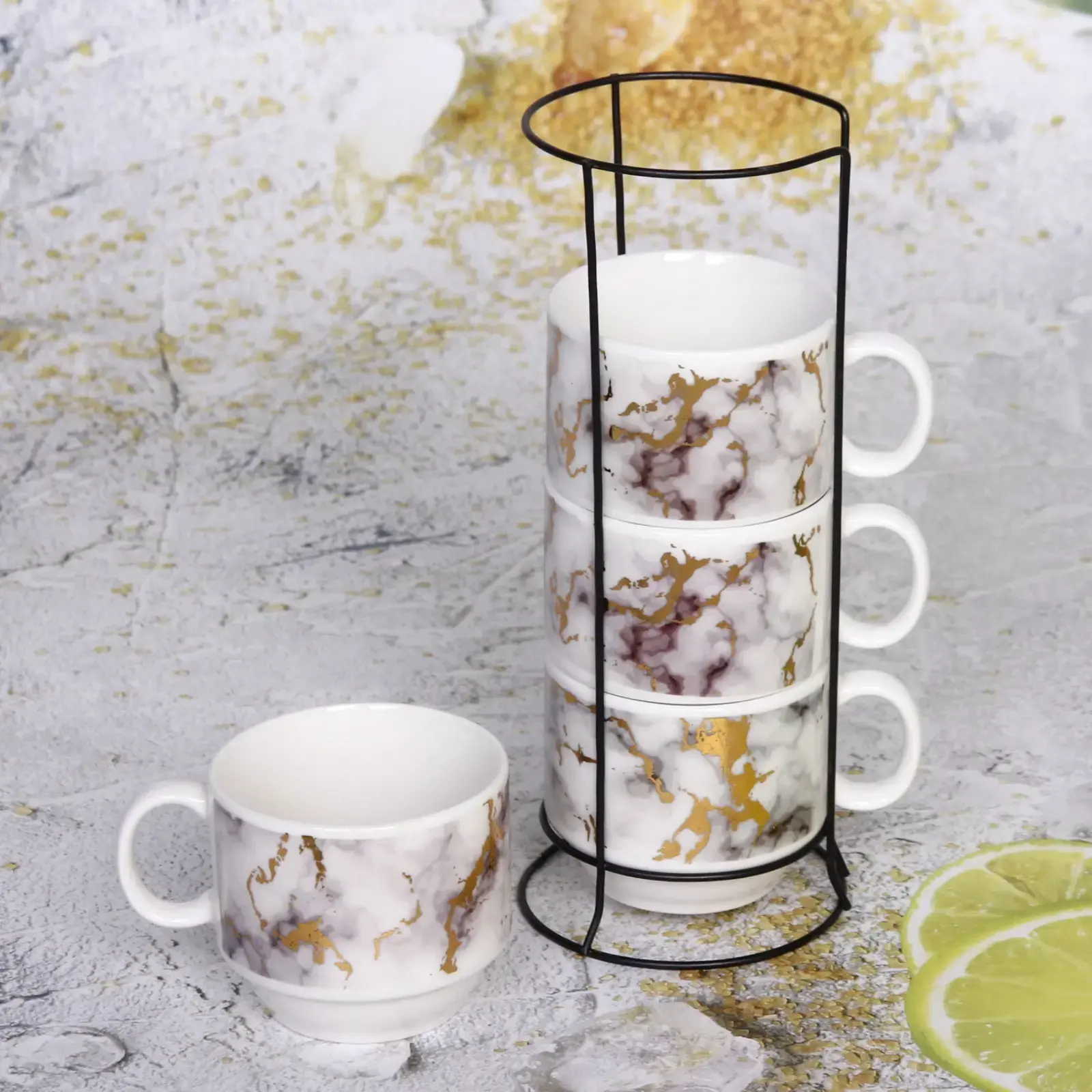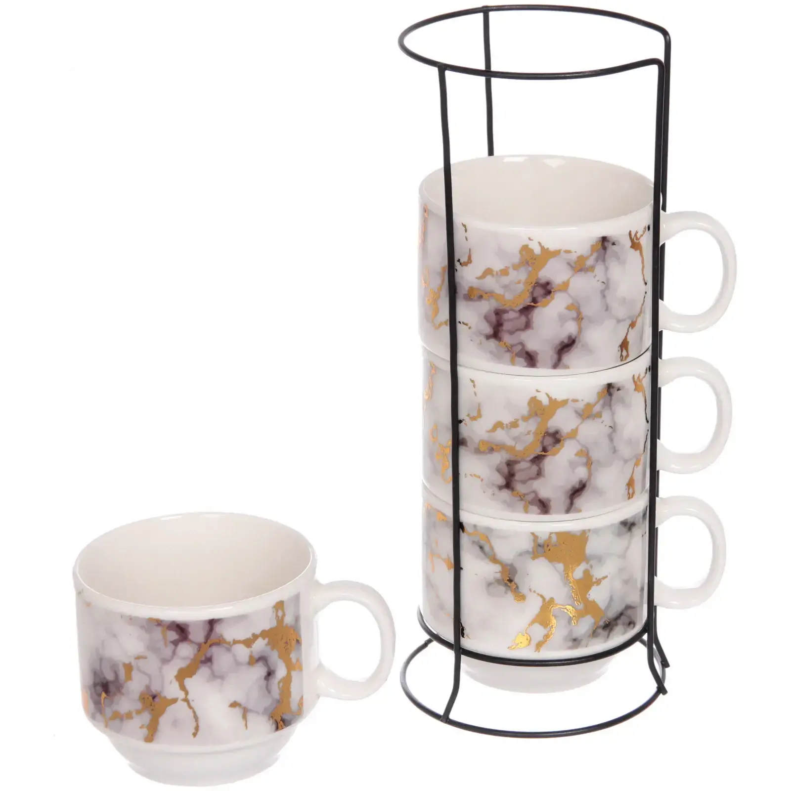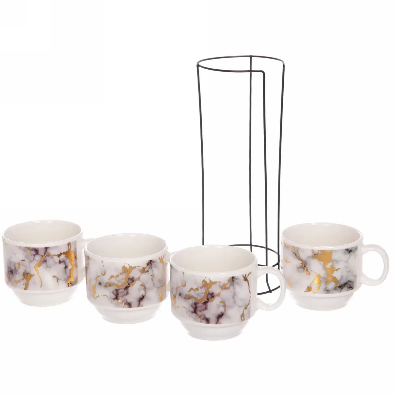 Набор включает четыре кружки, аккуратно размещенные на стильной металлической стойке. Это не только экономит место на столе, но и добавляет изюминку в интерьер вашей кухни или столовой. Кружки идеально подходят для чая, кофе или других горячих напитков, а их современный дизайн делает их отличным выбором для любого случая.