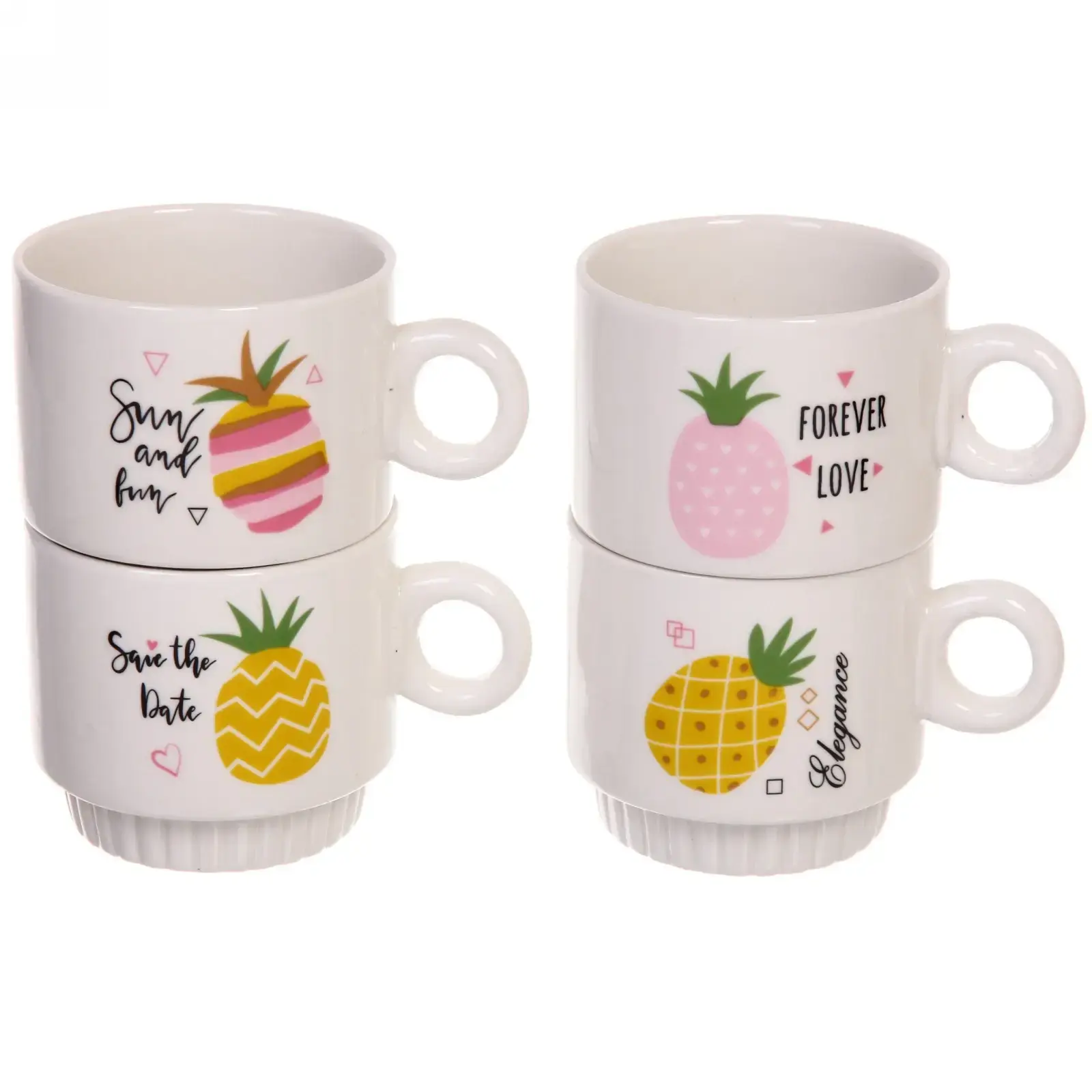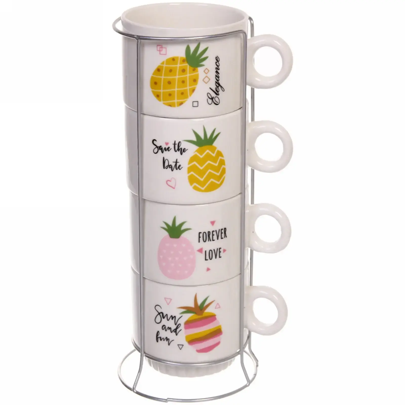 Удобный комплект из 4 керамических кружек с оригинальными рисунками ананасов и мотивирующими надписями станет идеальным дополнением вашей кухни. Металлическая подставка обеспечивает компактное хранение и легкий доступ к любимым чашкам.