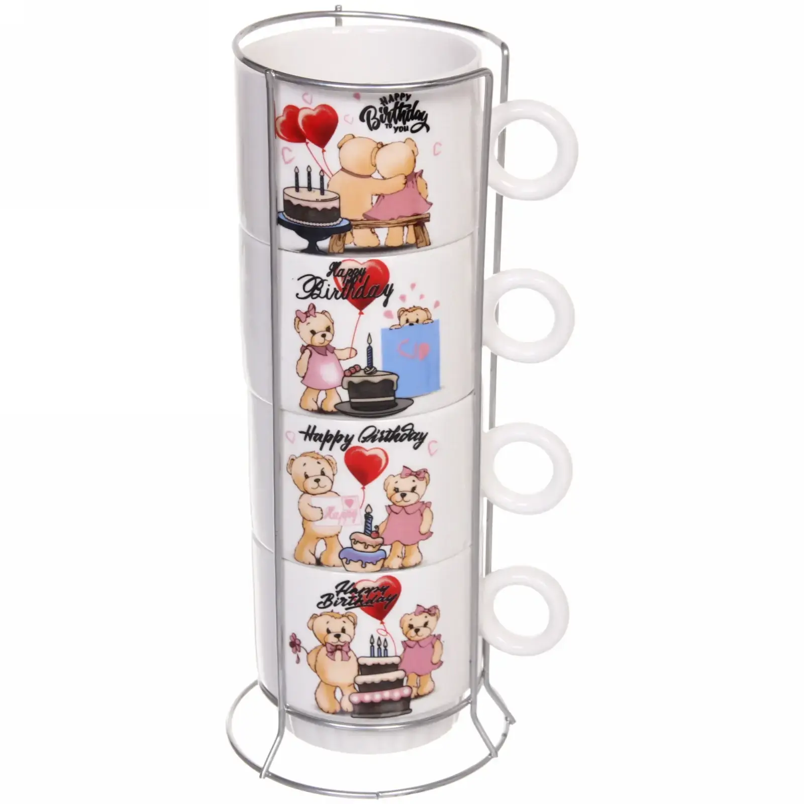 Яркие кружки с милыми медвежатами и надписью «Happy Birthday» превратят любое чаепитие в незабываемый праздник. Удобная металлическая стойка экономит пространство на кухне и позволяет всегда держать посуду под рукой.