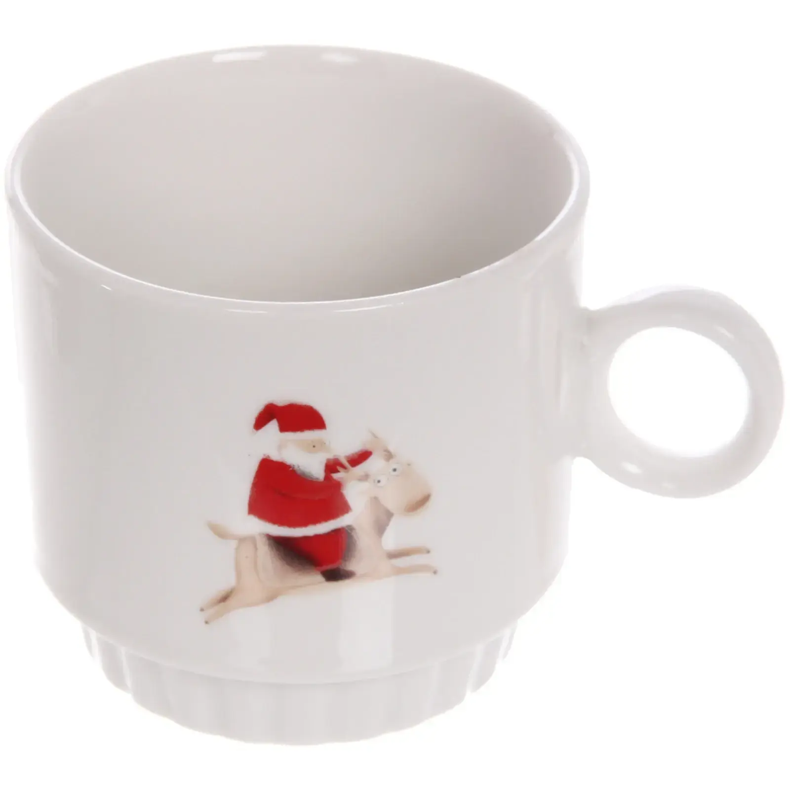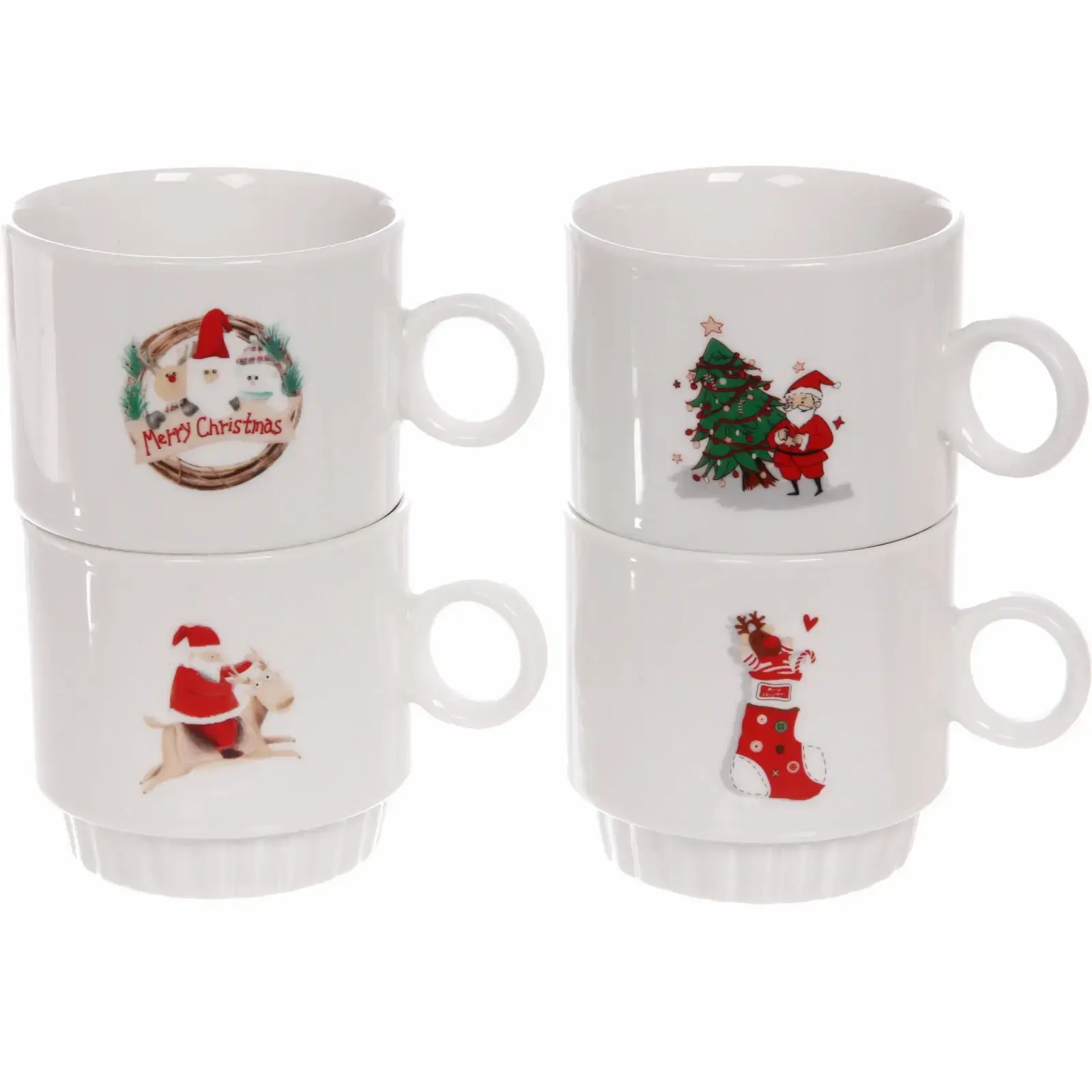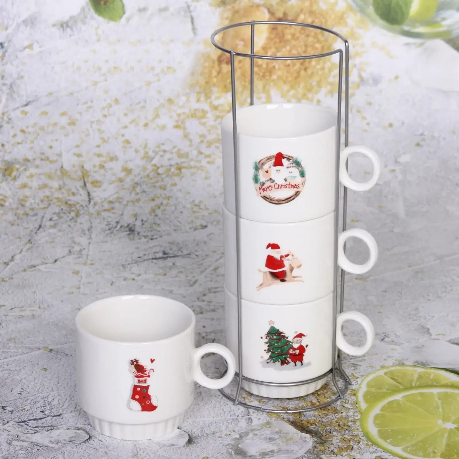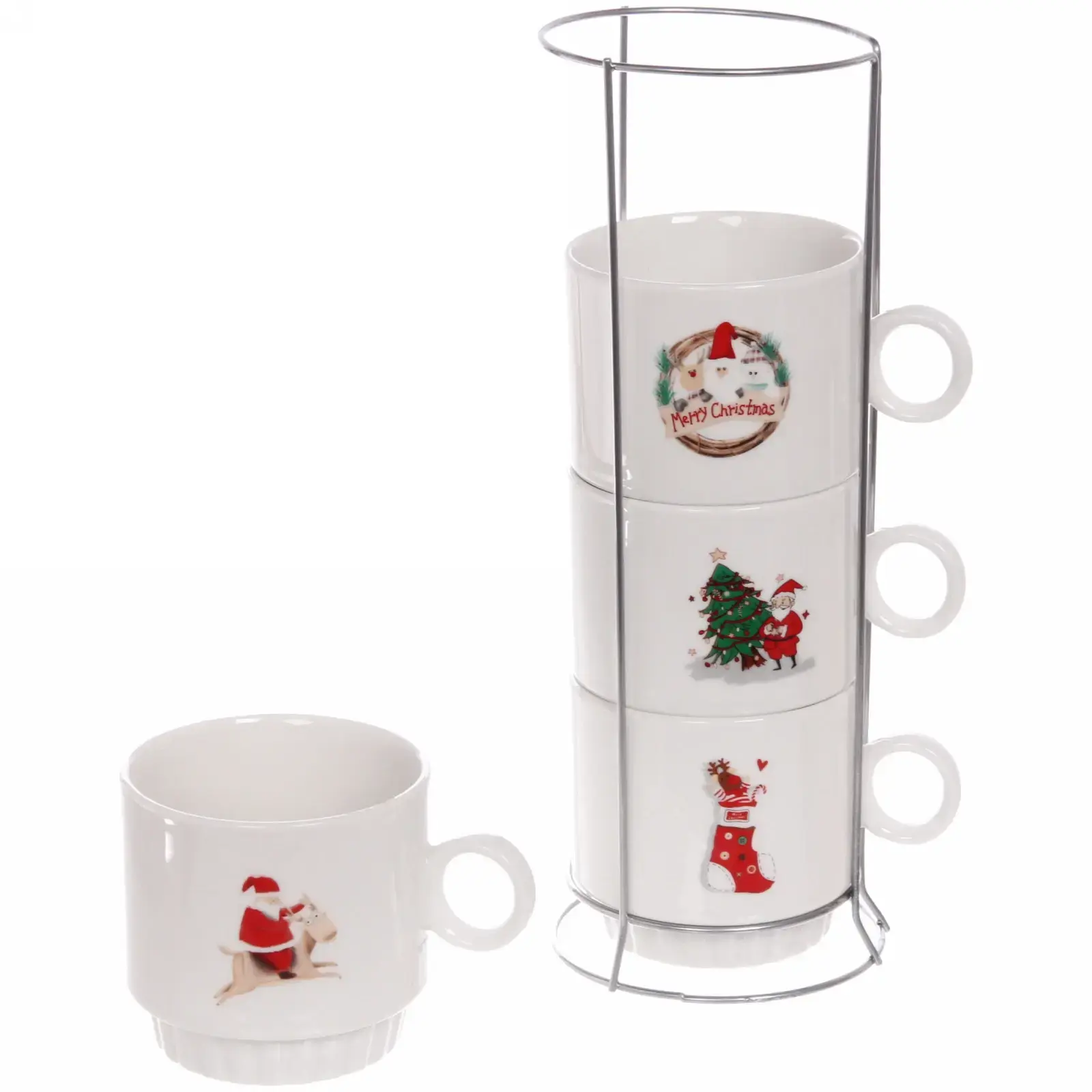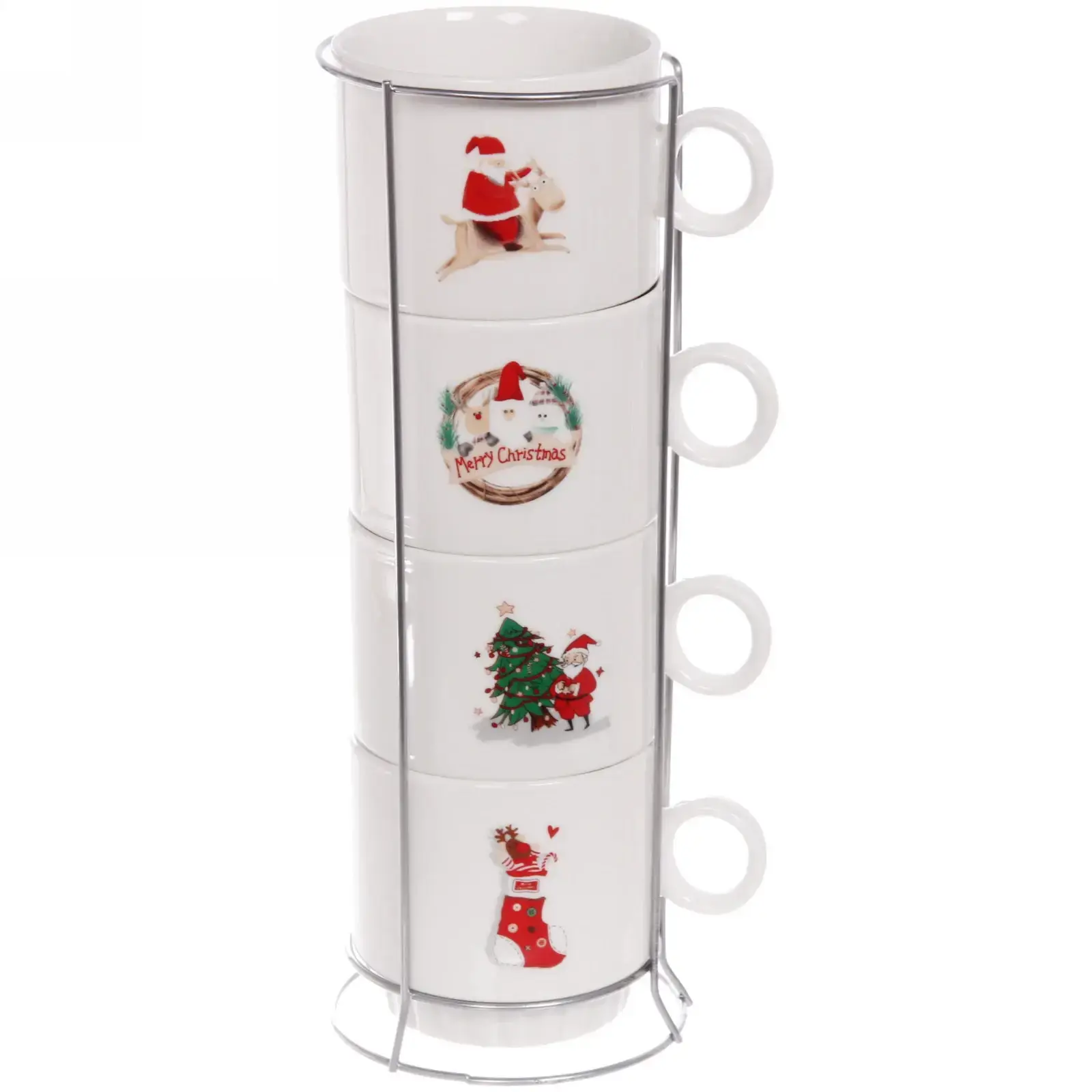 Каждая кружка украшена оригинальным рисунком: Санта-Клаус, рождественская елка, праздничные надписи и символы. Благодаря компактной подставке, набор экономит место на кухне, сохраняя при этом привлекательный внешний вид.