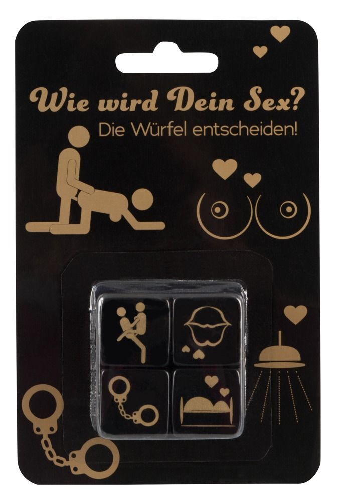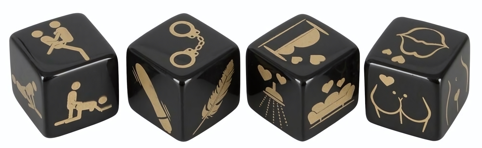 Кубики изготовлены из безопасного пластика черного цвета с элегантным золотистым принтом. В набор входит 4 кубика, каждый из которых отвечает за определенный элемент игры: позиции, место действия, аксессуары и области тела.